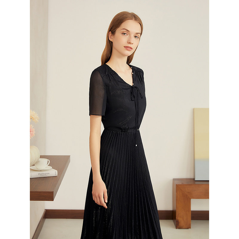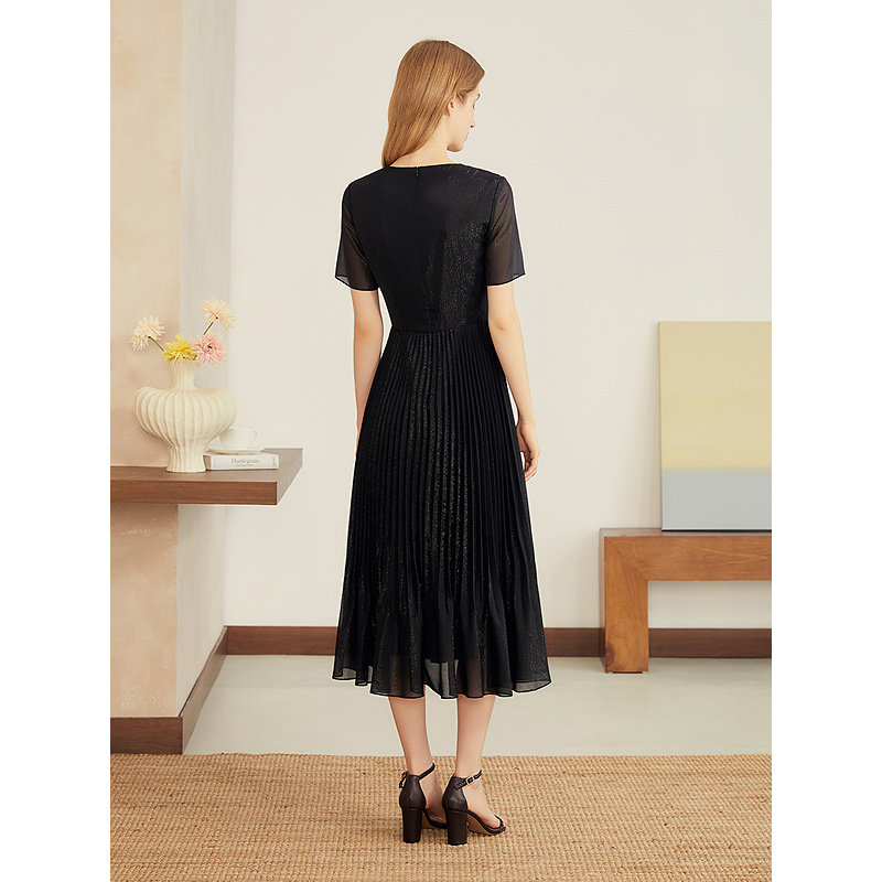 YINER音儿专选2025秋季新款法式星闪肌理雪纺小黑裙风琴褶连衣裙