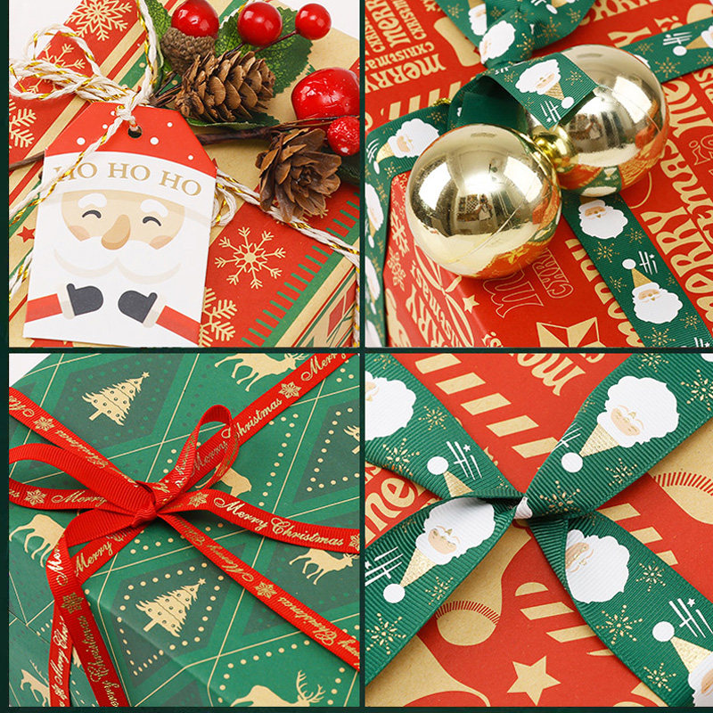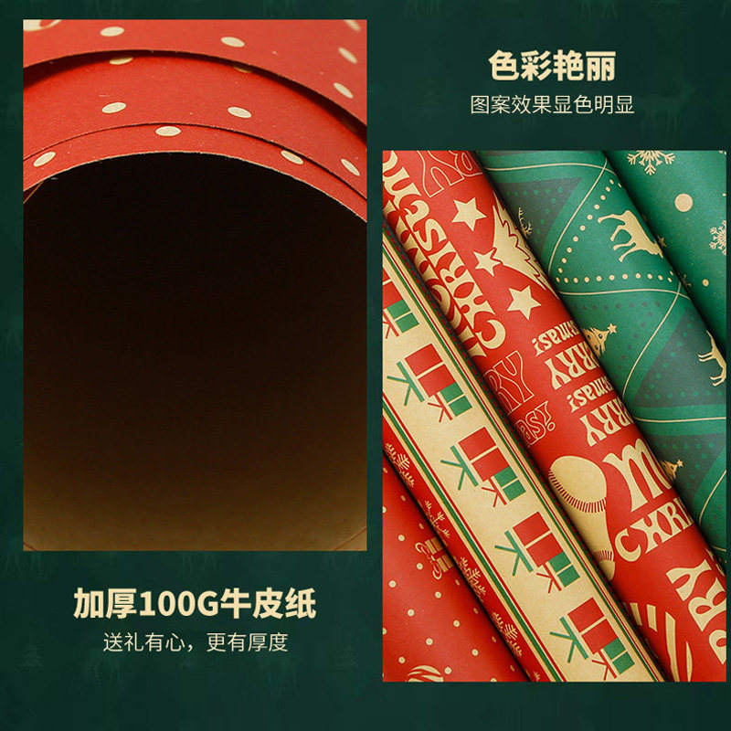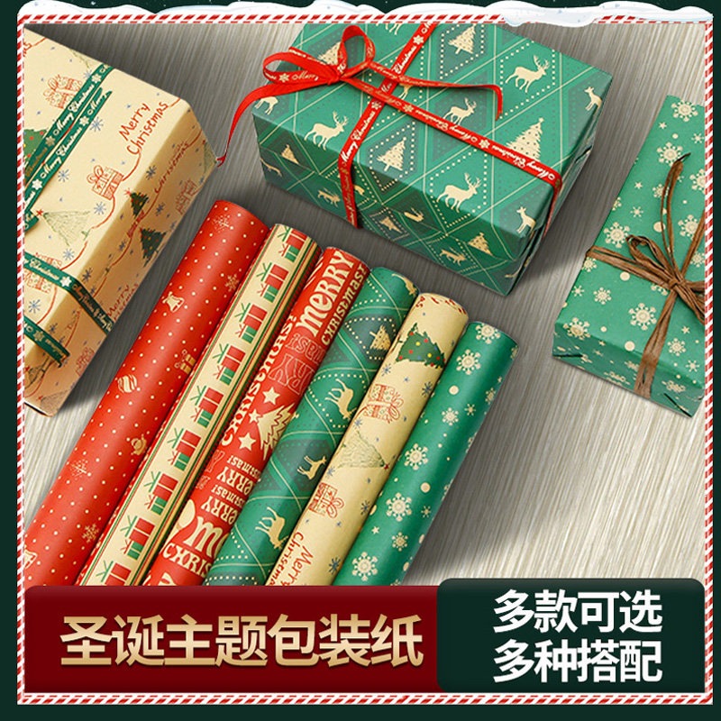 【五张装】圣诞节包装纸礼物礼品礼盒圣诞纸花纸手工diy材料超大尺寸高级牛皮包书纸高颜值打包纸加丝带节日