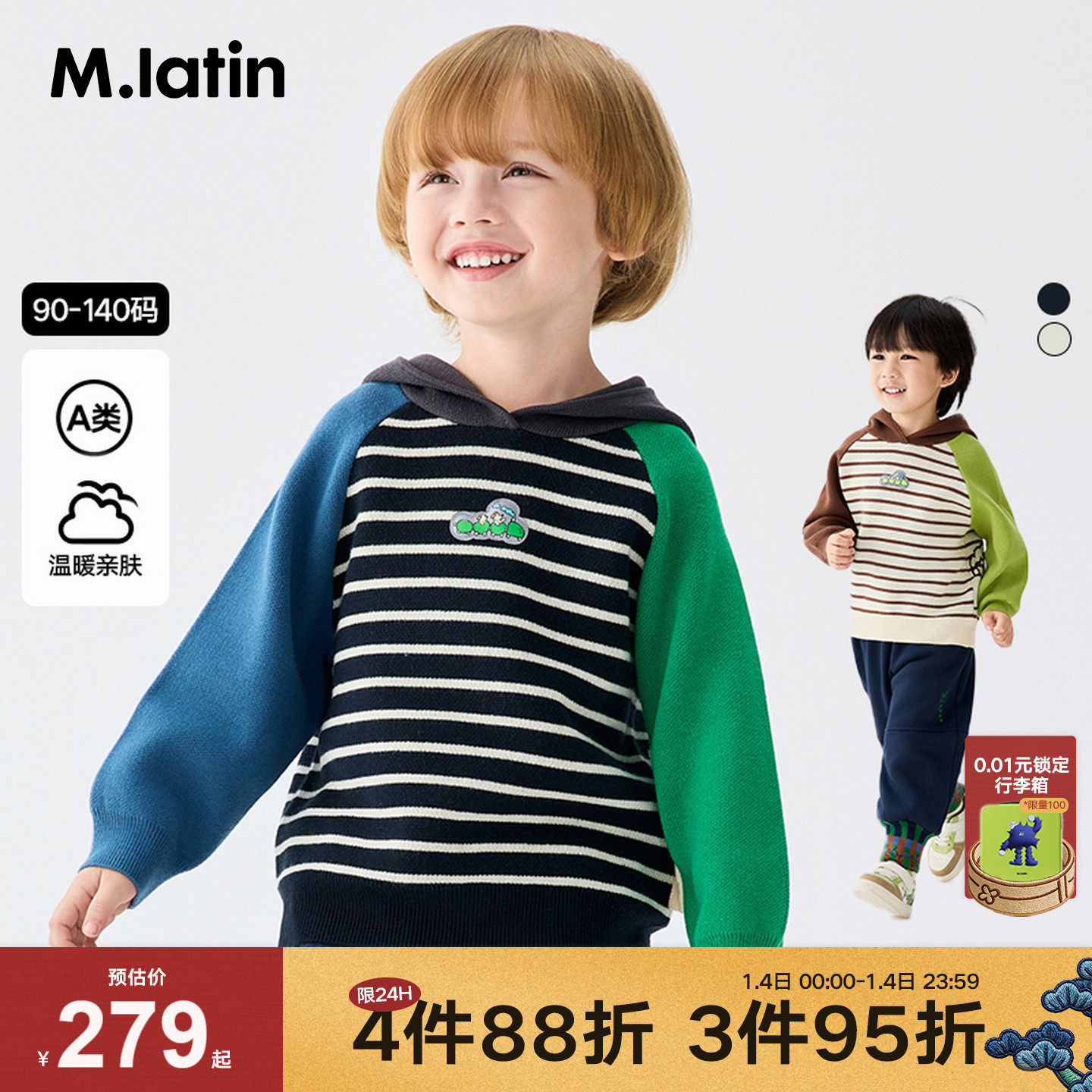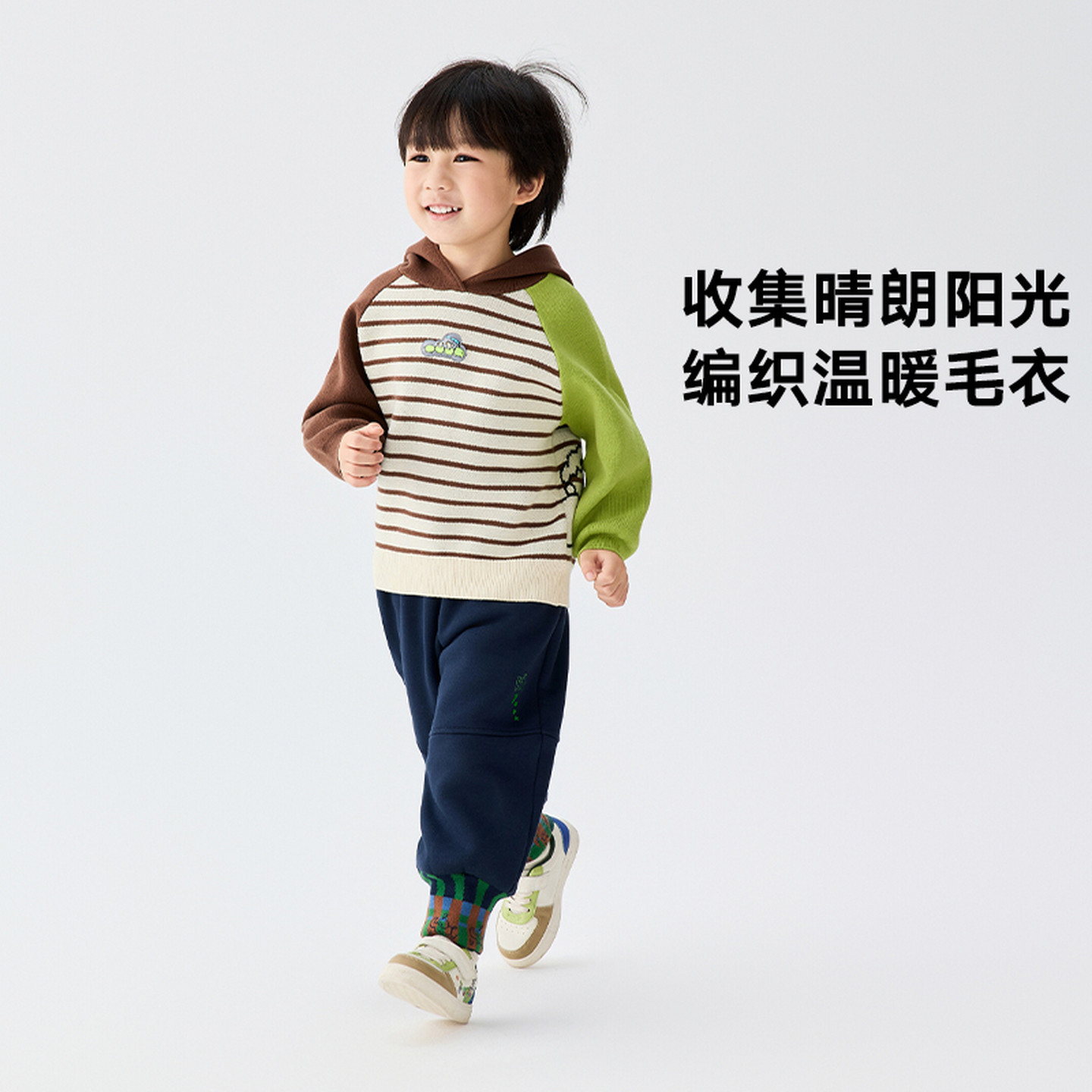 马拉丁儿童毛衣25冬装新款男童小童毛巾织撞色插肩袖连帽毛衣