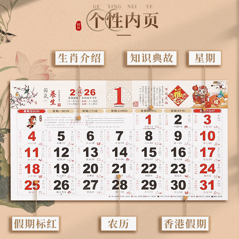 2026年挂历新款马年中国风红色大四开高档福牌家用创意挂墙手撕日历大号挂式大尺寸月历年历公司定制礼品广告