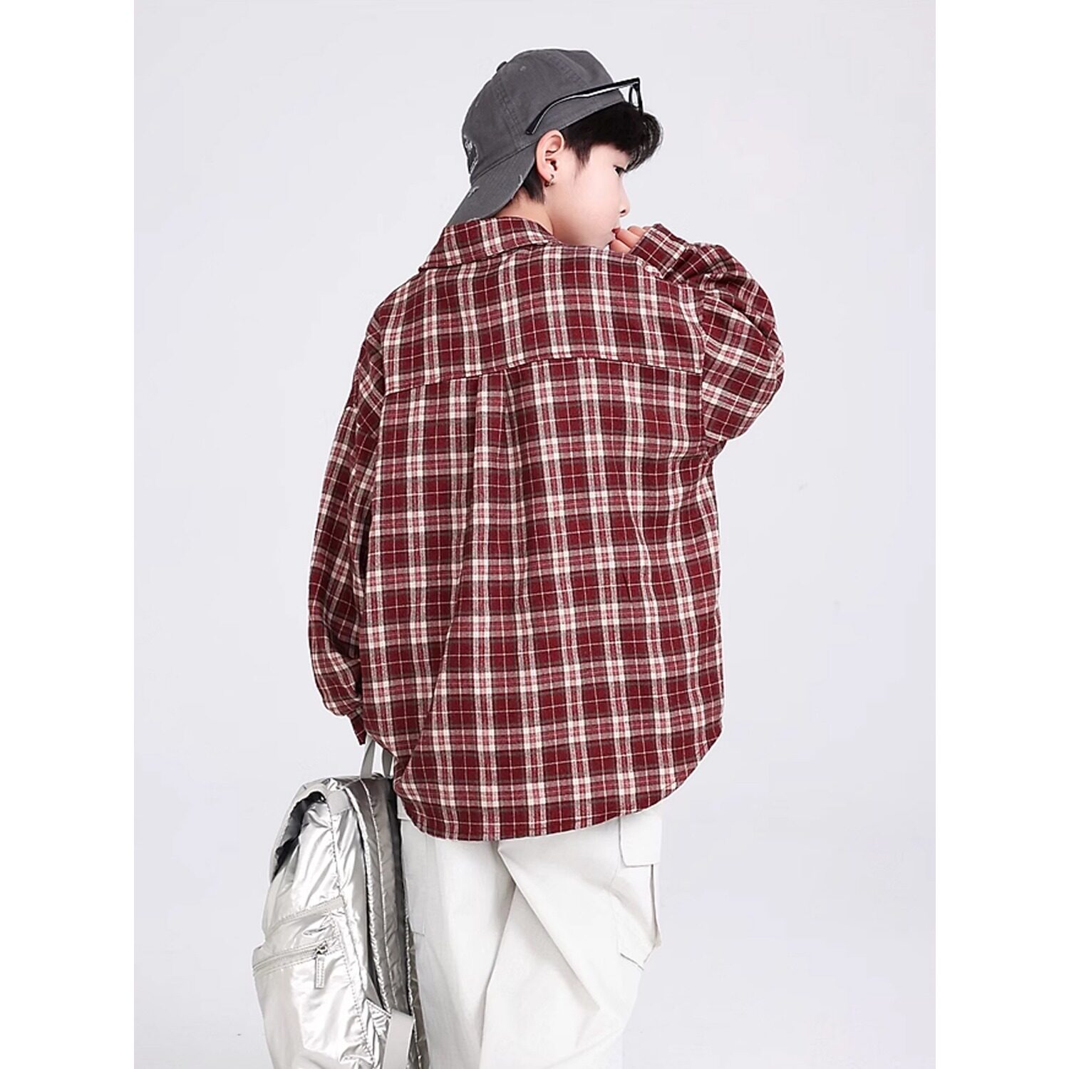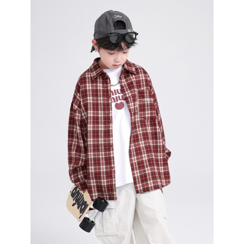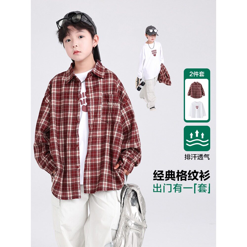 男童红色格子衬衫春秋款2026新款儿童秋装衬衣时尚中大童衣服炸街