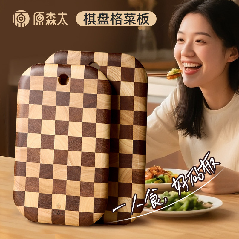 原森太棋盘格菜板防霉抗菌家用实木砧板食品级厨房专用水果切菜板