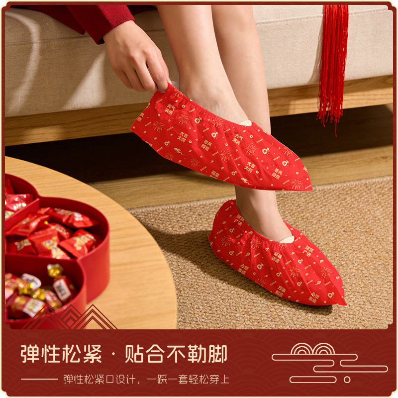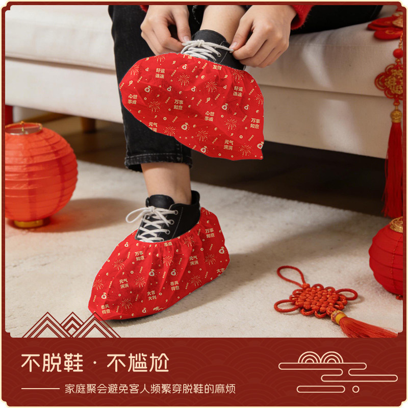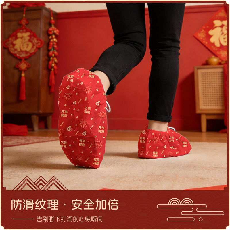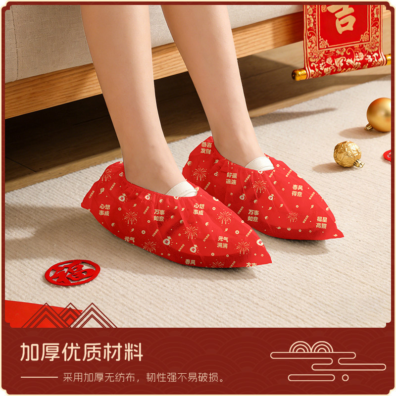 鸿运当头一次性鞋套加厚耐磨成人学生防滑室内透气红色无纺布鞋套