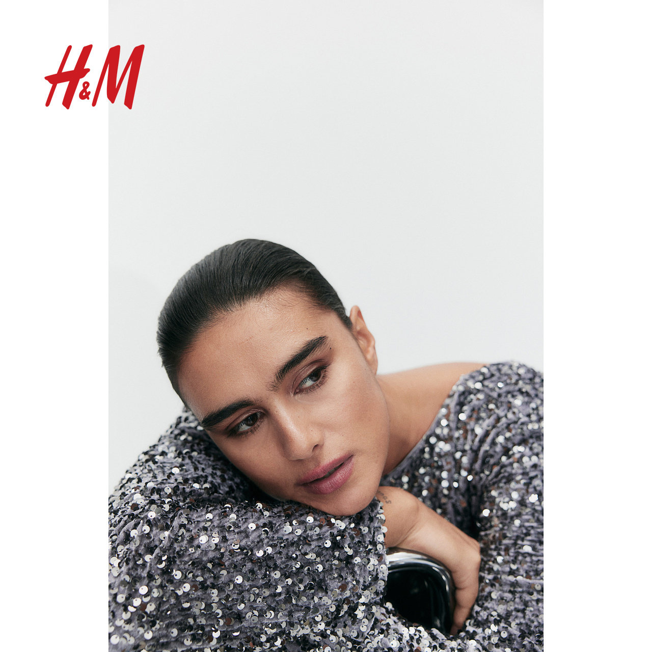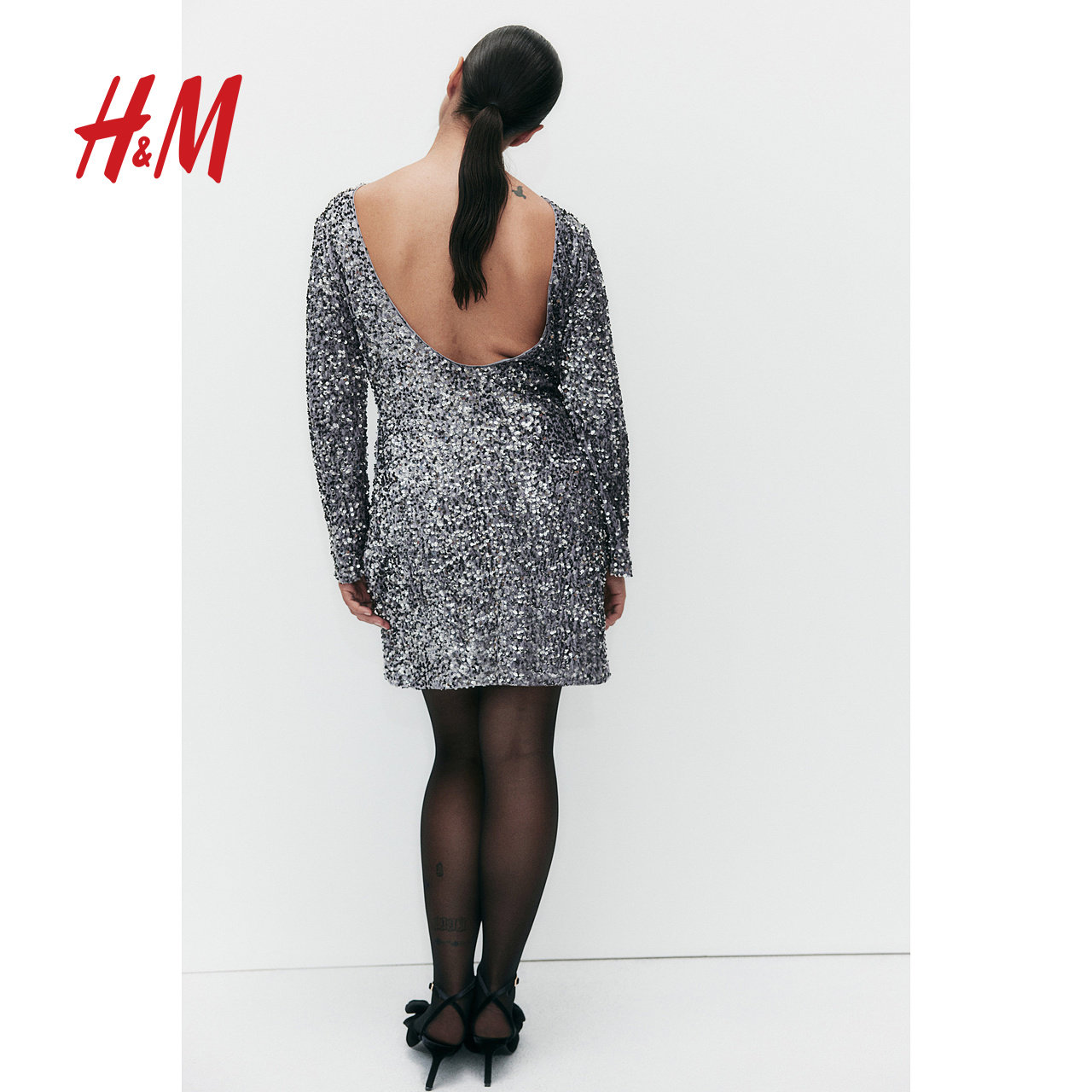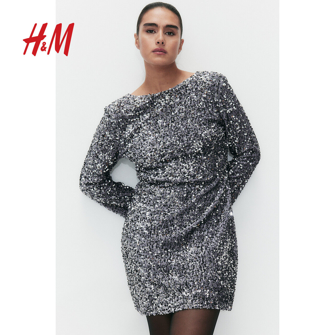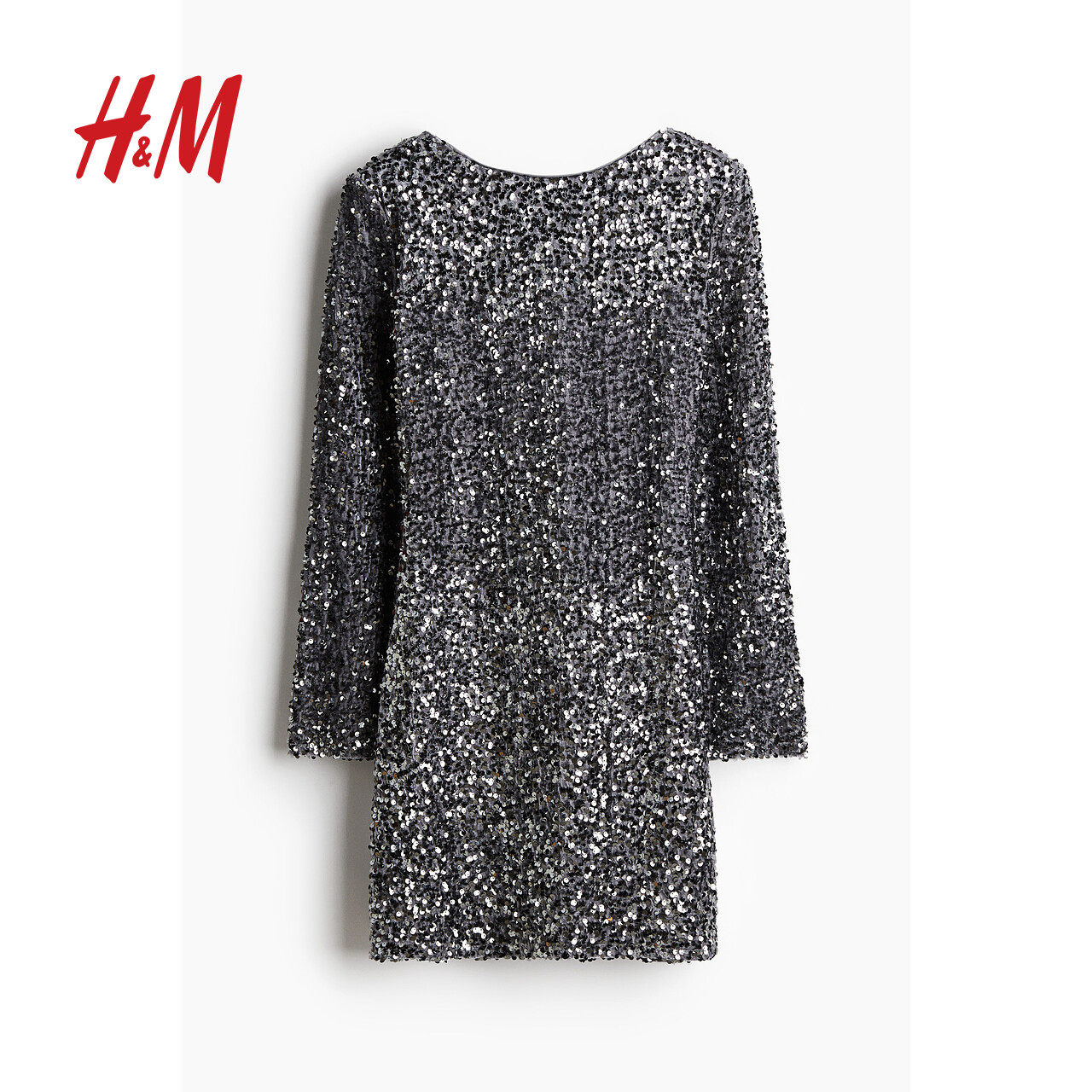 HM女装连衣裙春季长袖亮片低露背一字领H版型短裙1245452