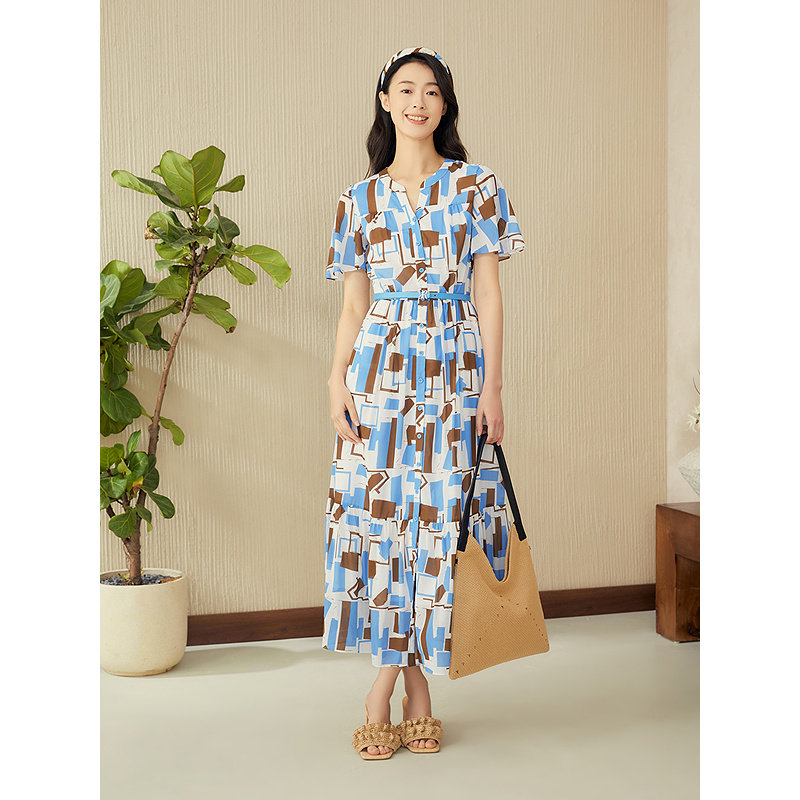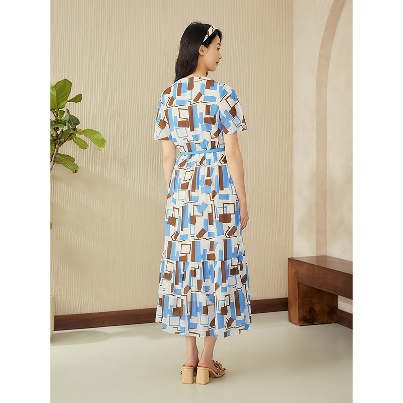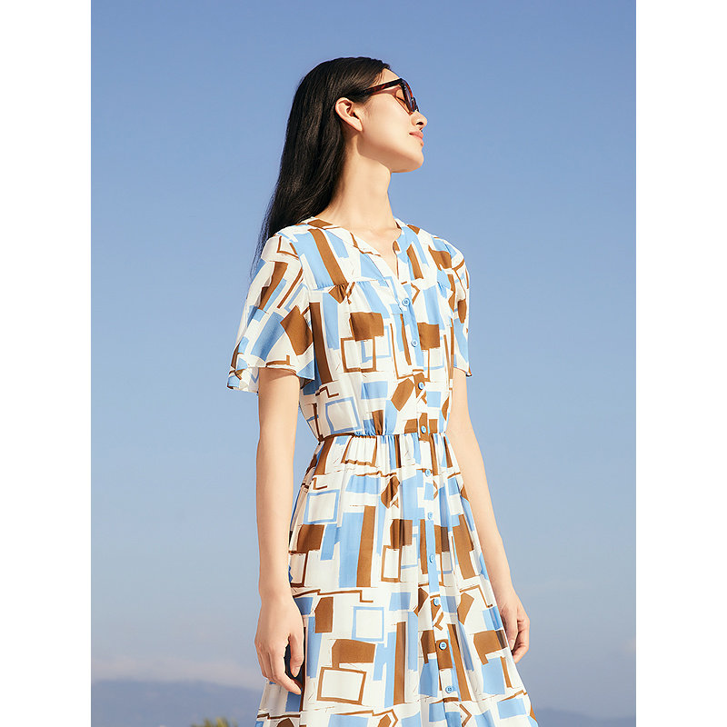 【真丝系列】YINER音儿2025夏季新款法式撞色几何印花V领连衣裙