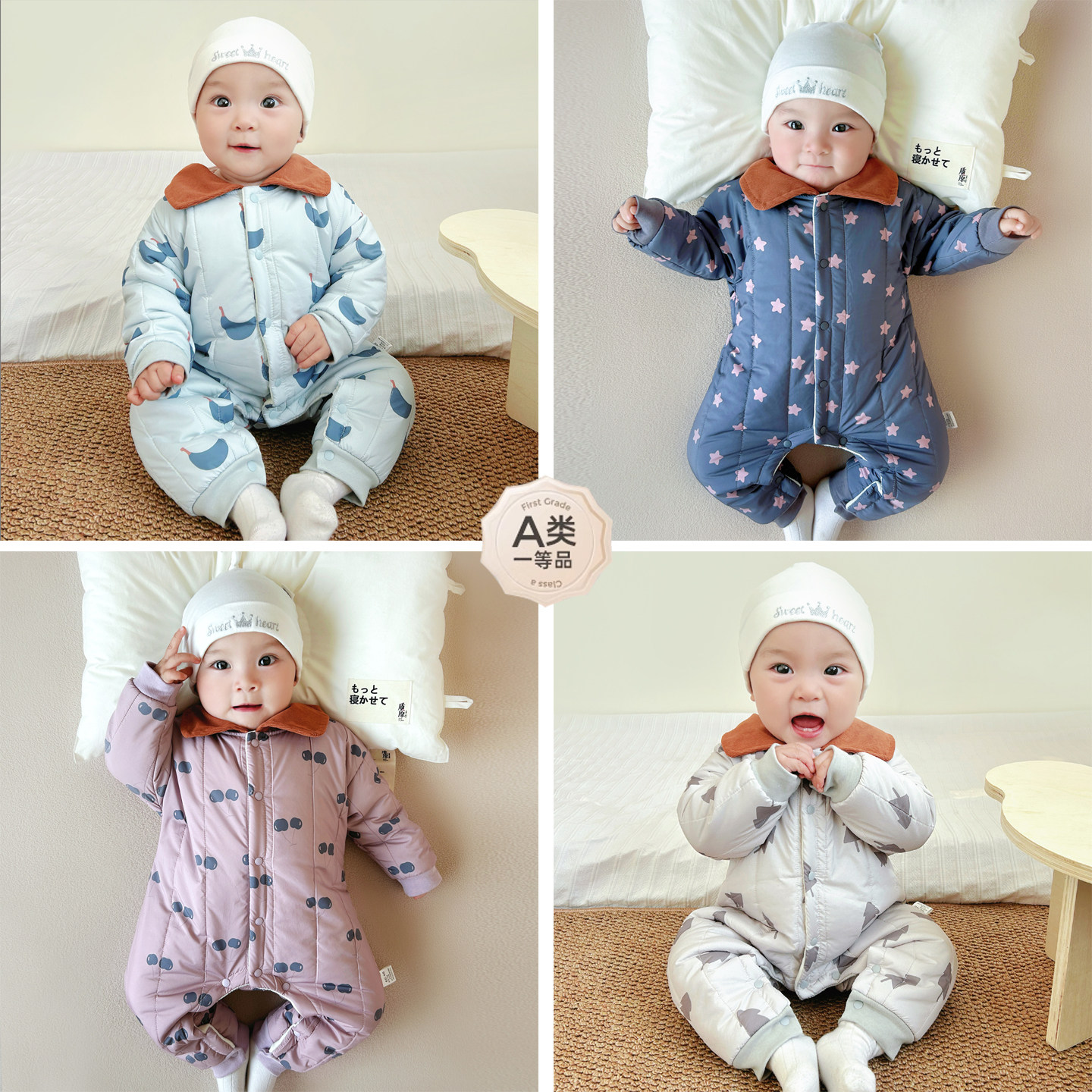 婧麒新生儿婴儿衣服秋冬夹棉满月纯棉初生宝宝秋装连体衣a类爬服