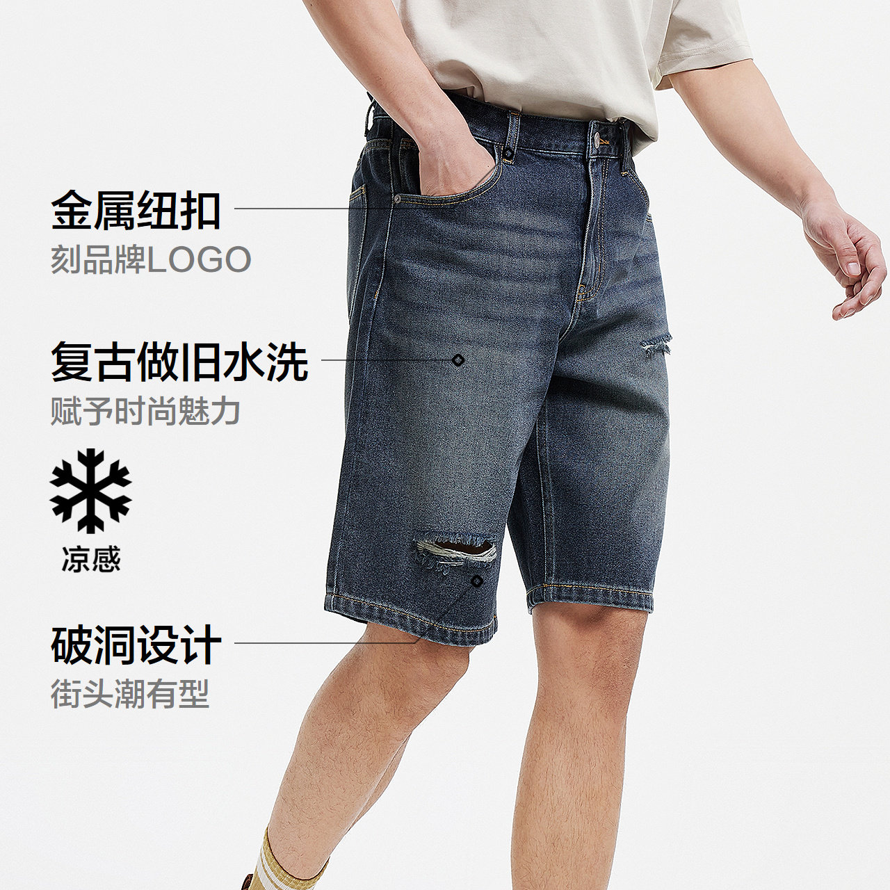 做旧复古破洞牛仔裤 凉感宽松五分短裤