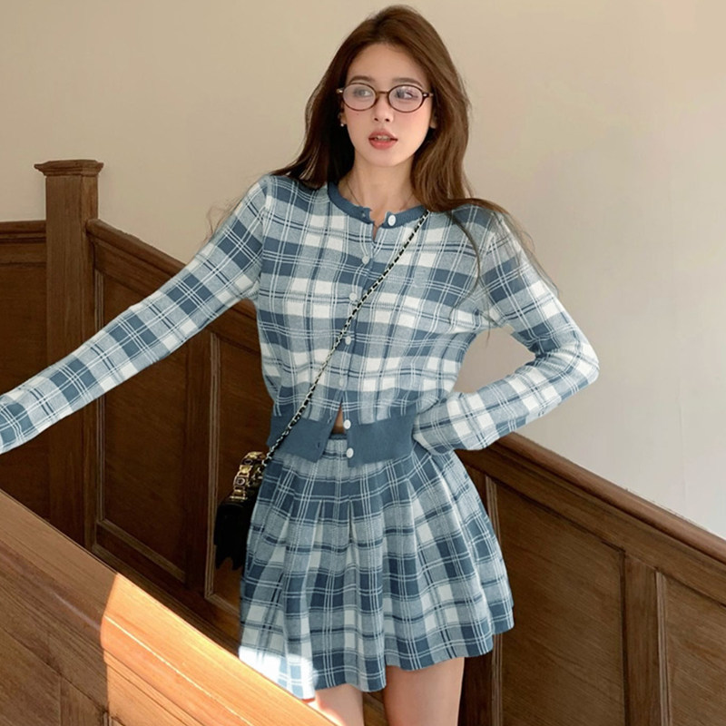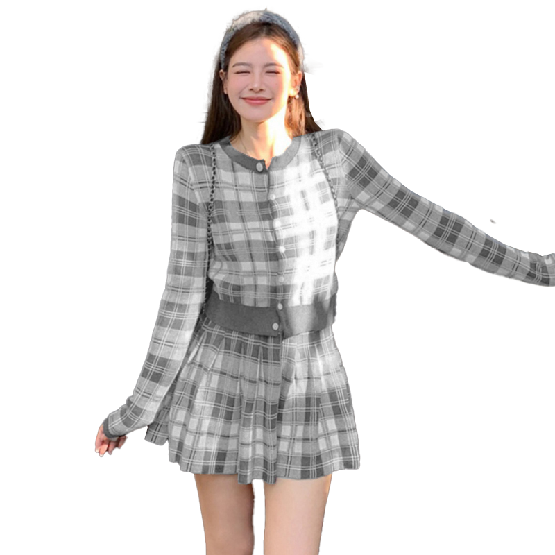 夕蒙2025新款秋季韩系上衣小个子独特别致格纹衬衫针织外套两件套