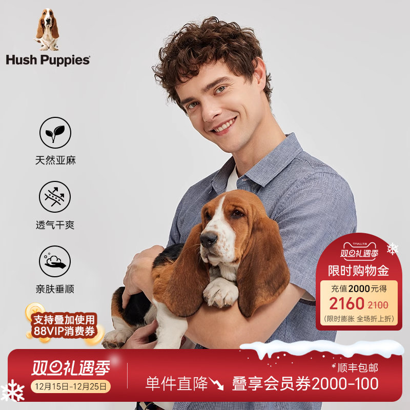 【棉麻混纺】暇步士男装2025夏季新款轻薄透气千鸟格纹短袖衬衫男