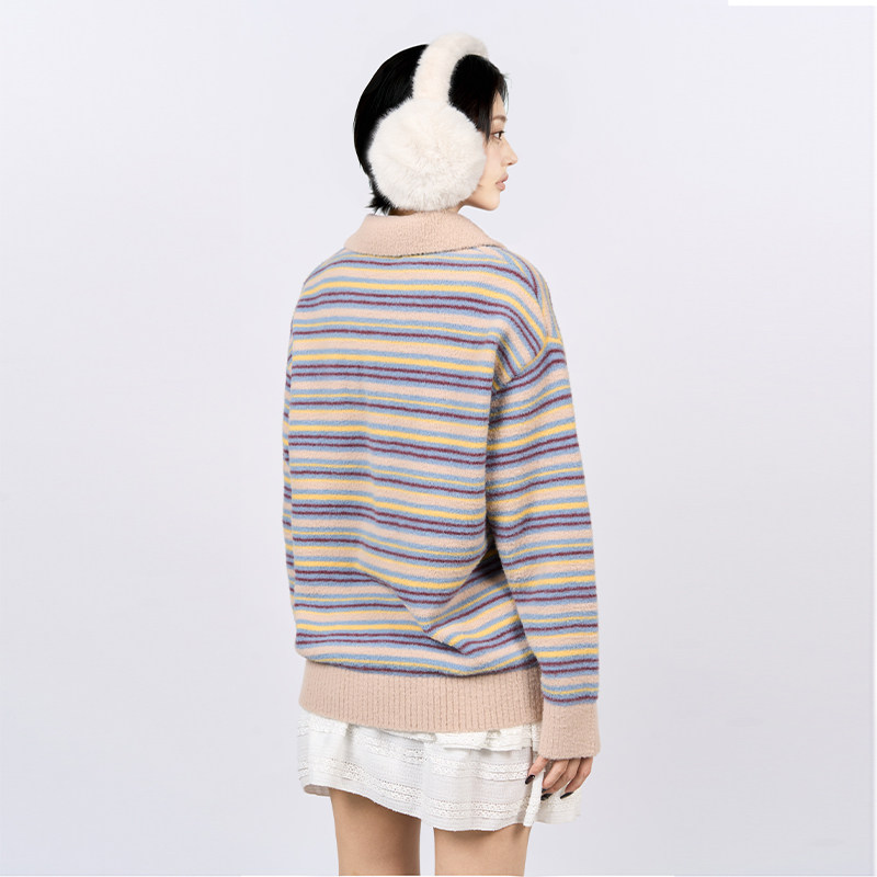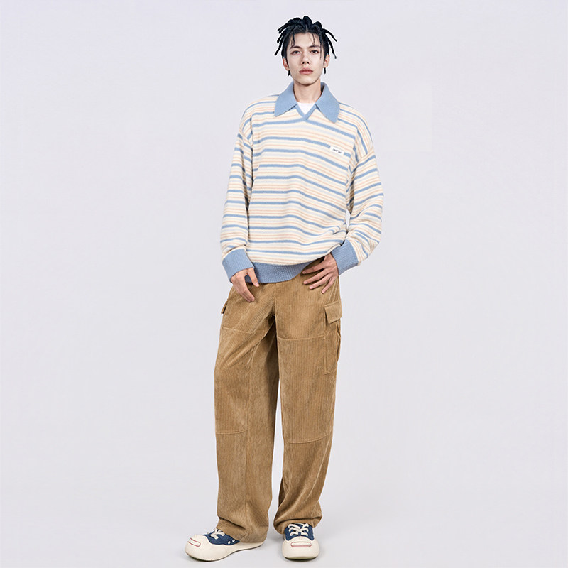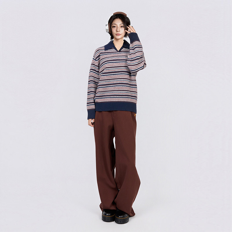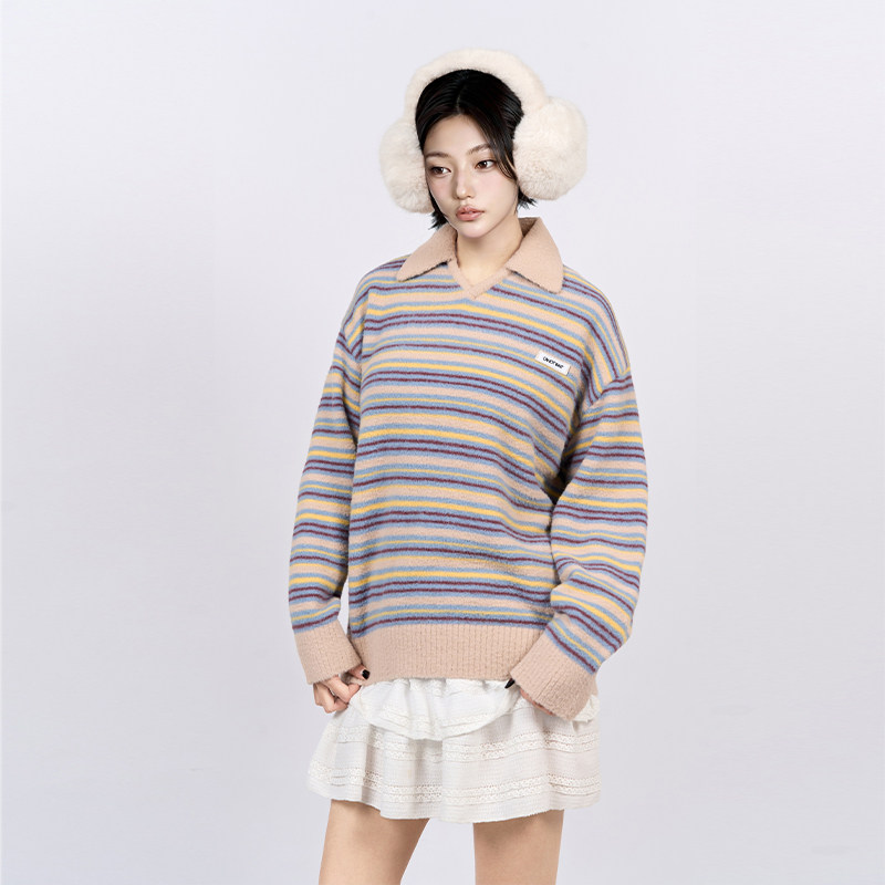 CANOTWAIT 拼色条纹POLO领套头毛衣情侣款慵懒风针织衫秋冬季新款