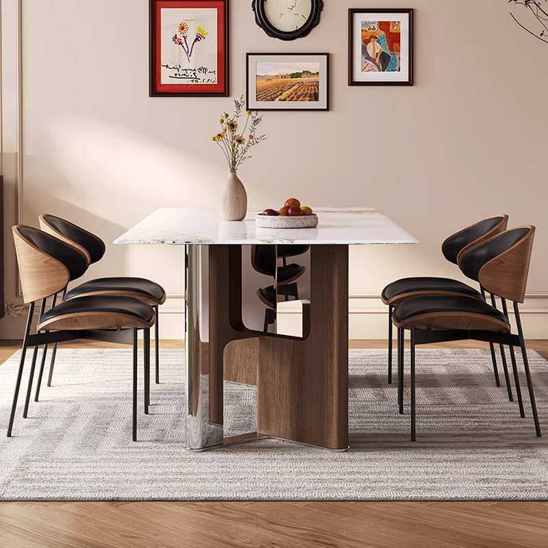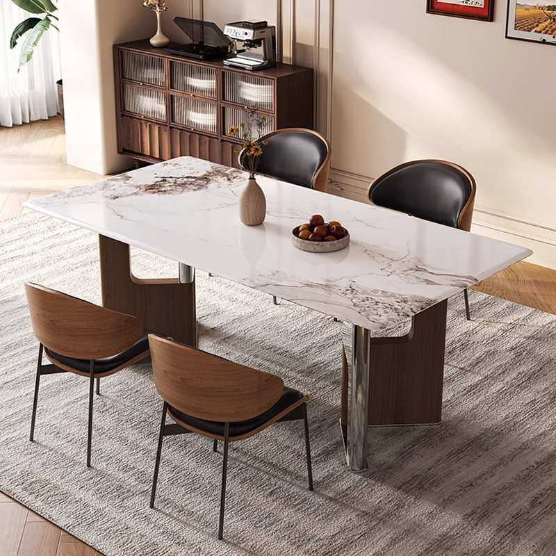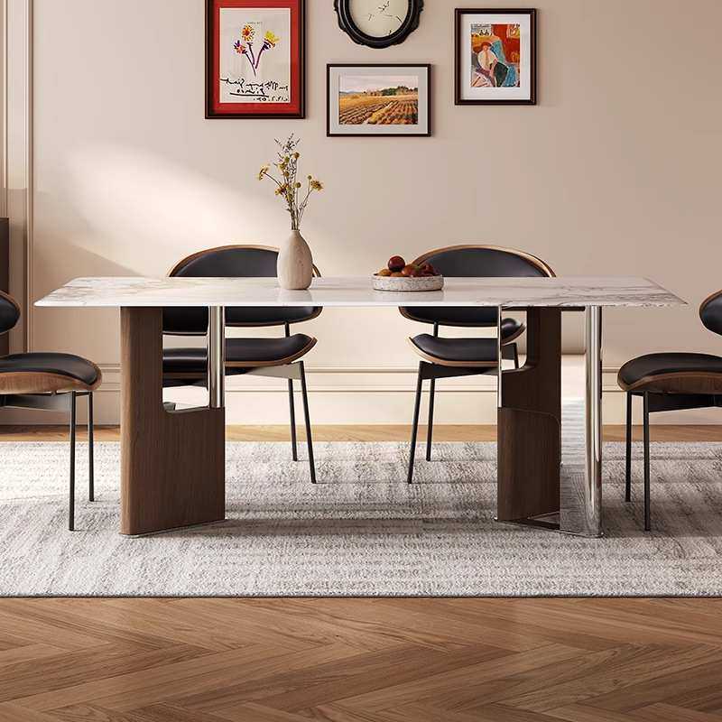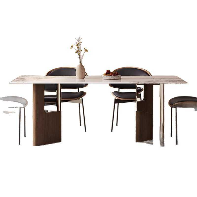 中古风微晶石餐桌长方形现代简约小户型家用餐桌不锈钢实木饭桌