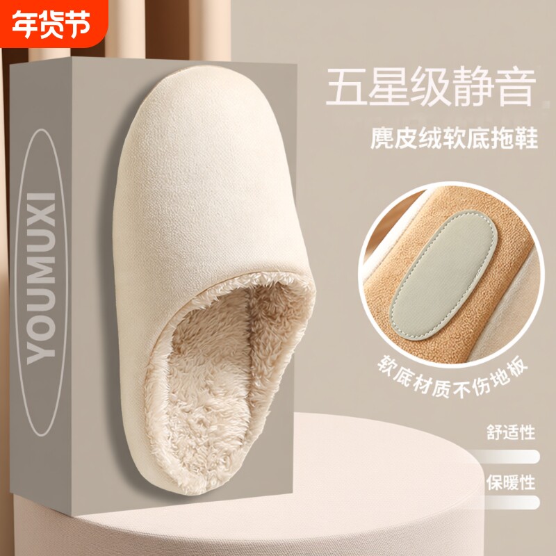日式无声静音拖鞋加绒女款室内居家用防滑四季木地板软底棉秋冬季
