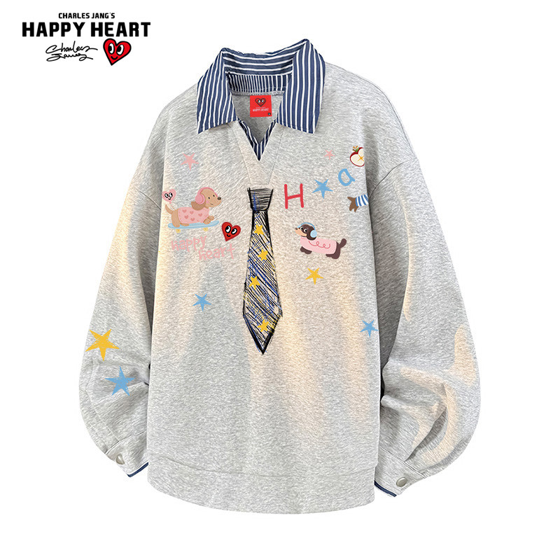 查尔斯桃心涂鸦领带假两件衬衫领加绒卫衣男春秋冬季情侣休闲上衣