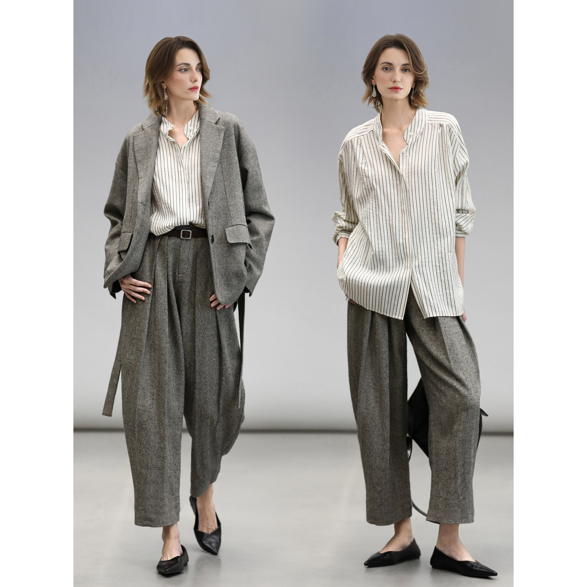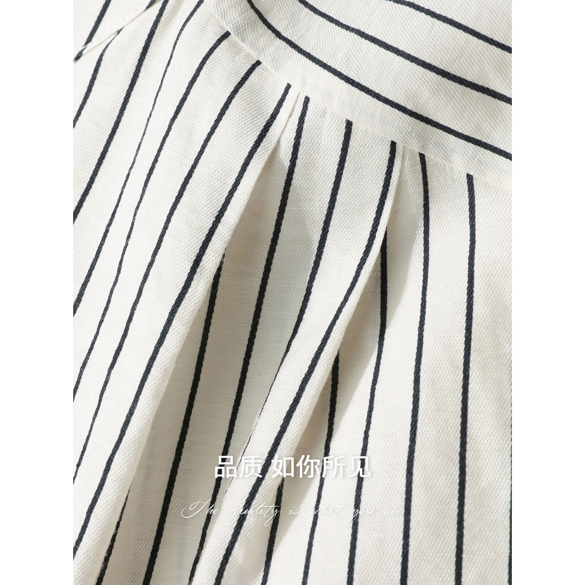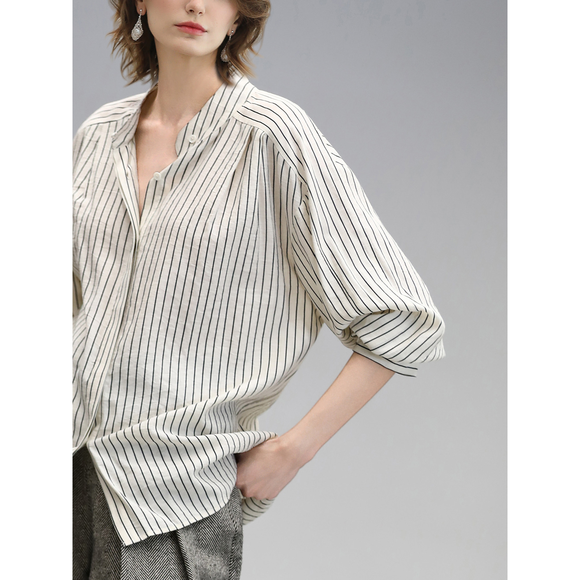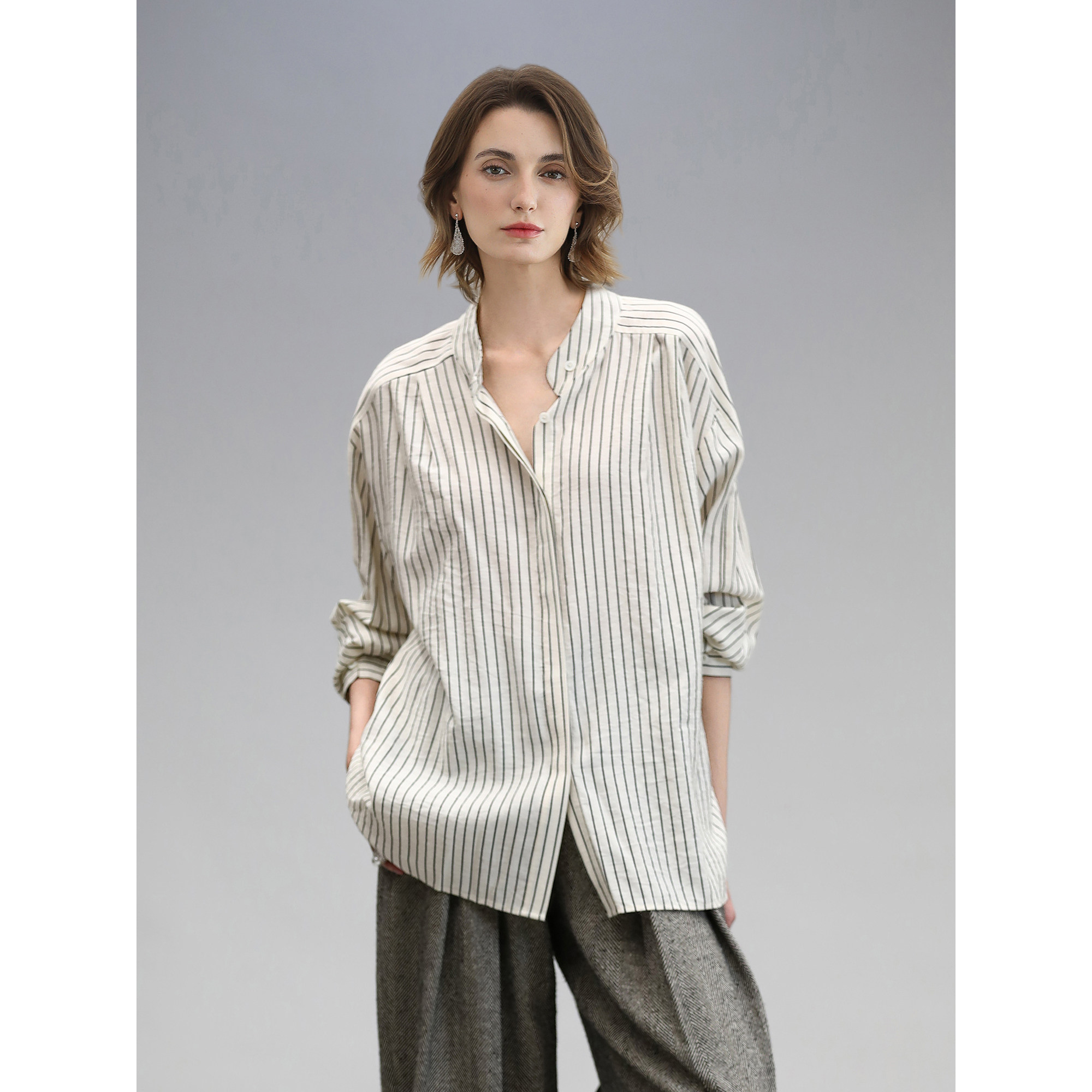 COCOBELLA设计感捏褶小立领条纹衬衫宽松仿棉麻长袖衬衣SR0019-2