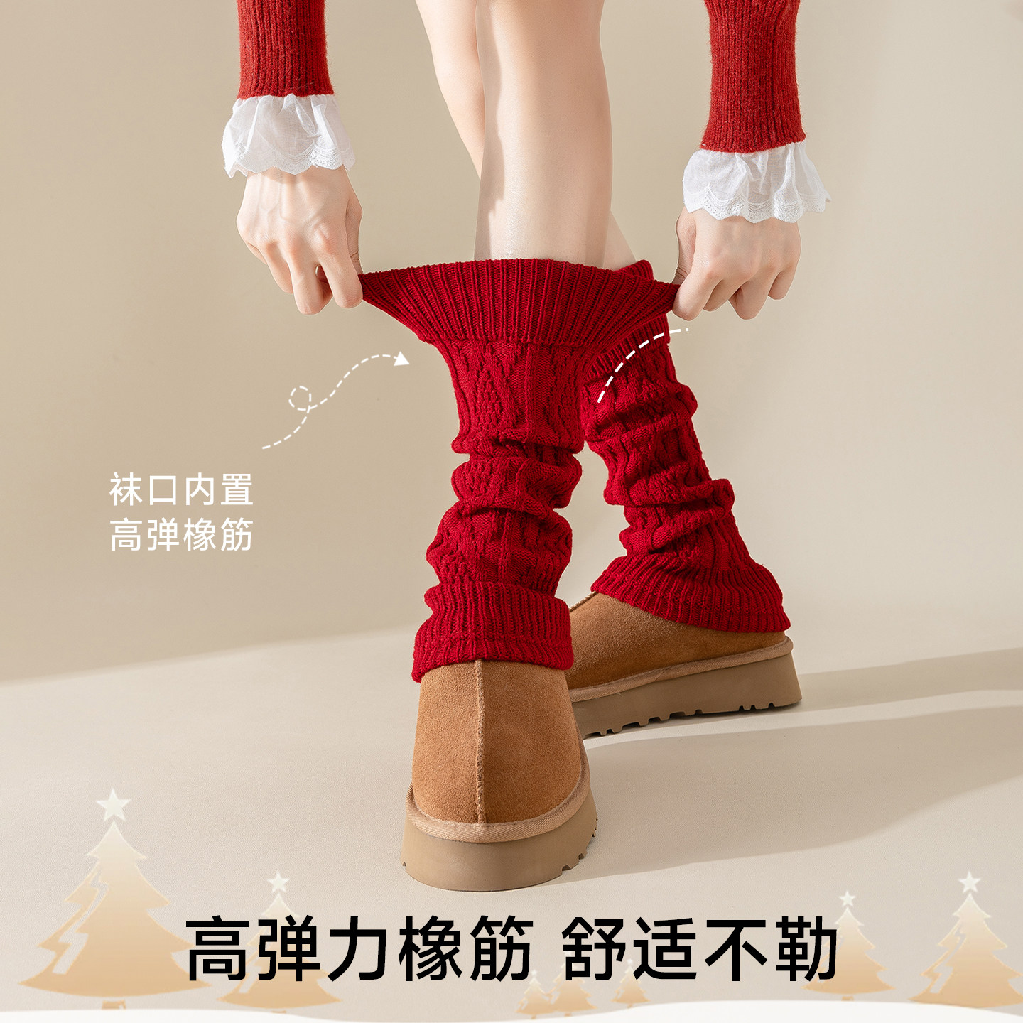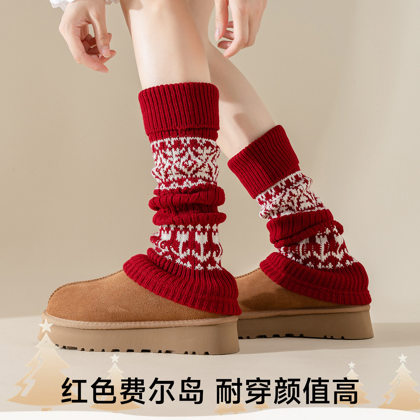 红色圣诞袜套费尔岛堆堆袜女款秋冬季加厚袜