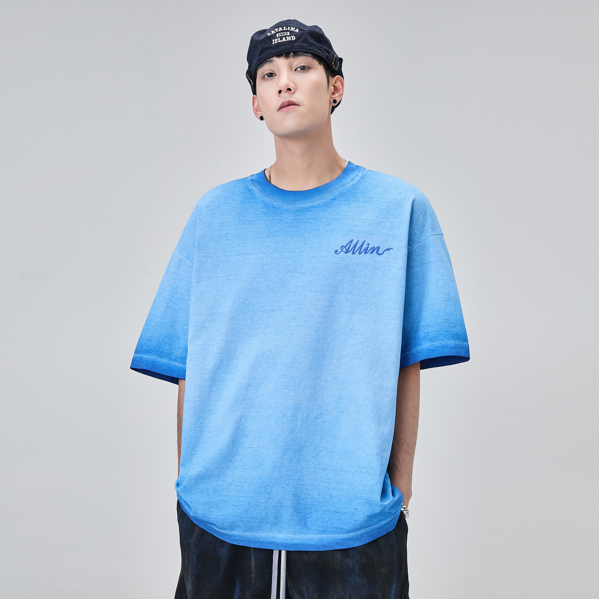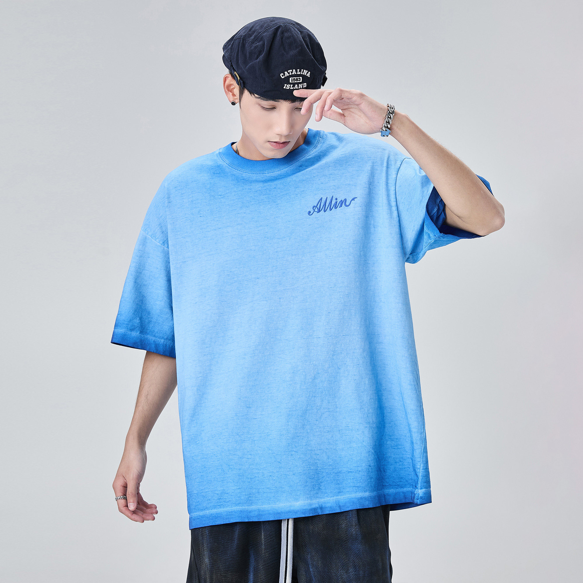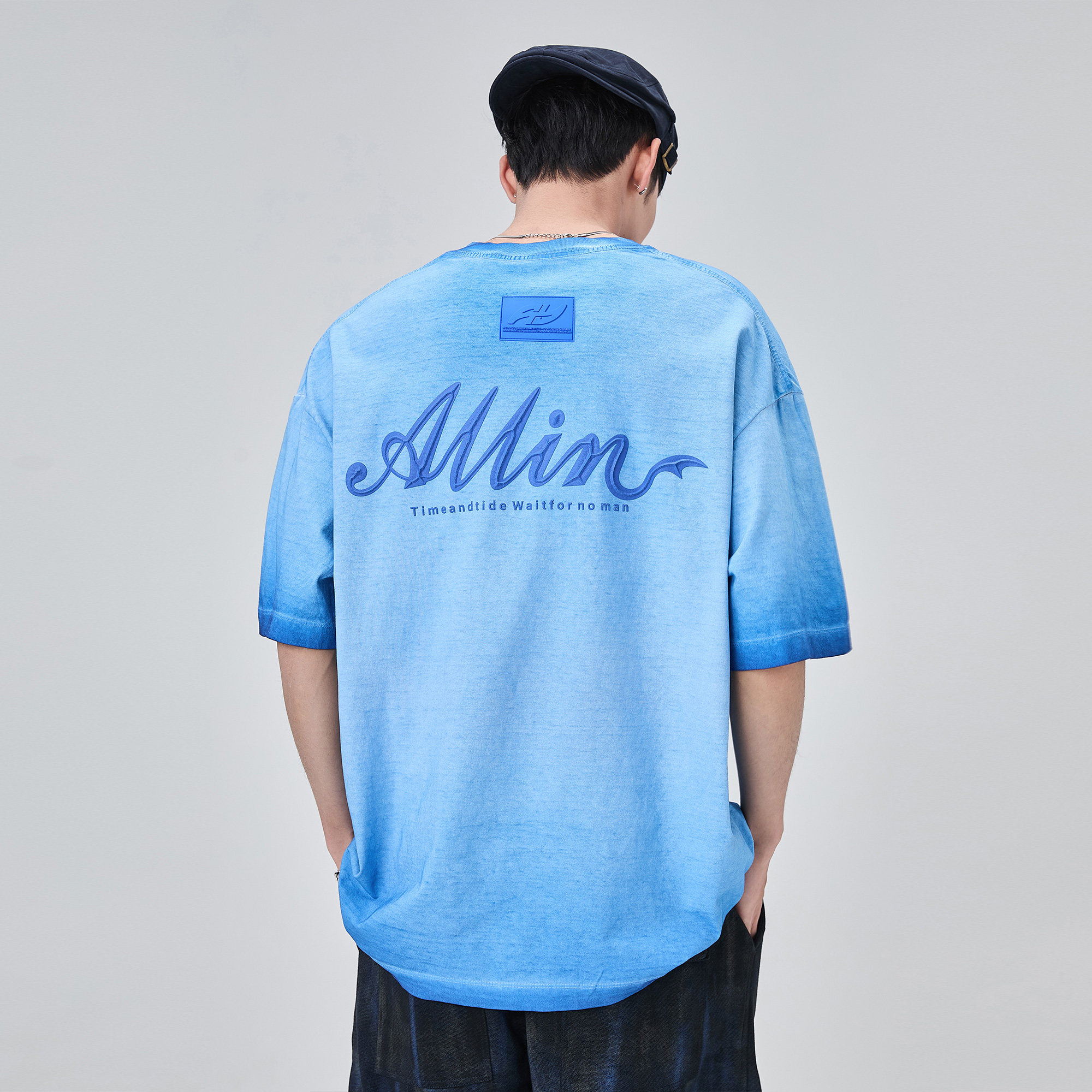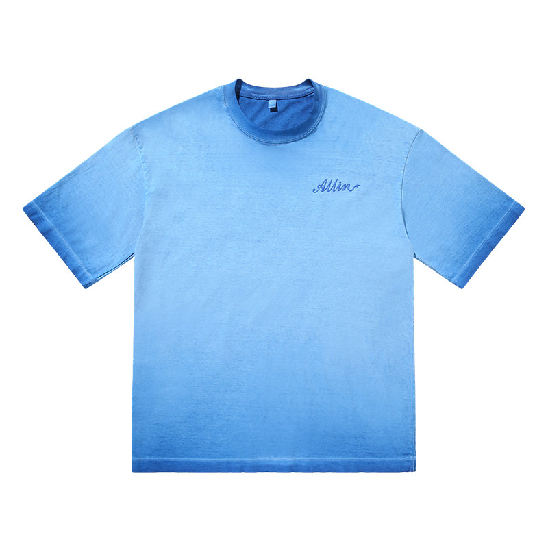 ALLIN 纯棉重磅水洗短袖t恤男夏季品牌字母印花蜡染渐变半袖上衣
