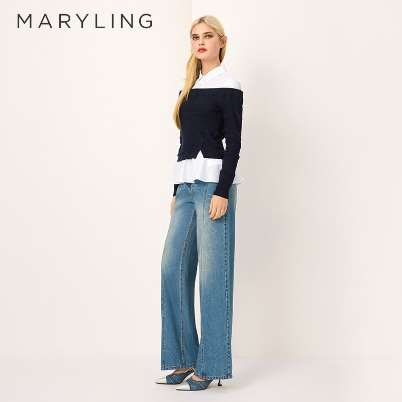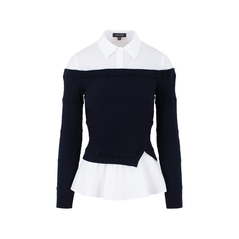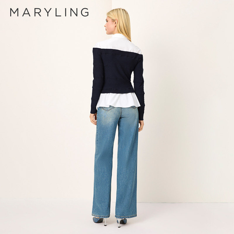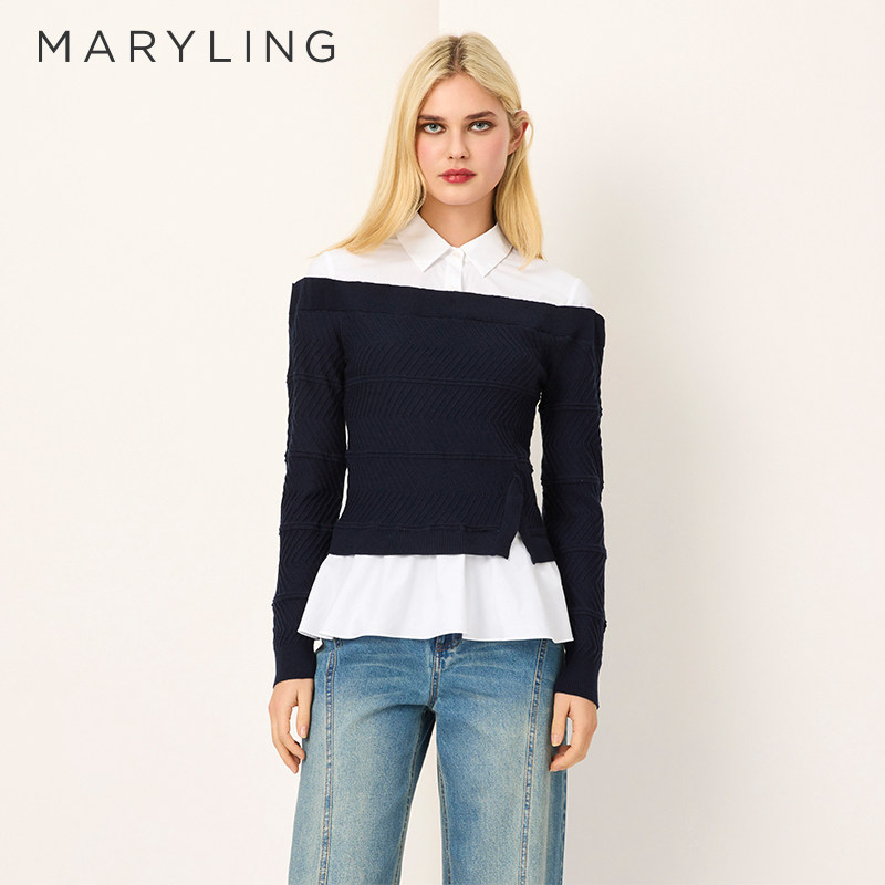 MARYLING玛俪琳2025春蓝白色衬衣领假两件式针梭配上衣A1FAW26030