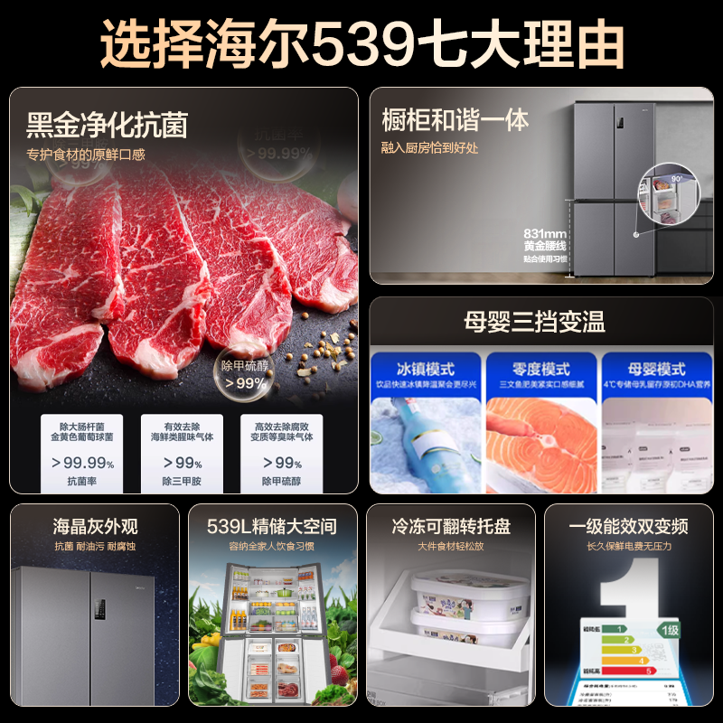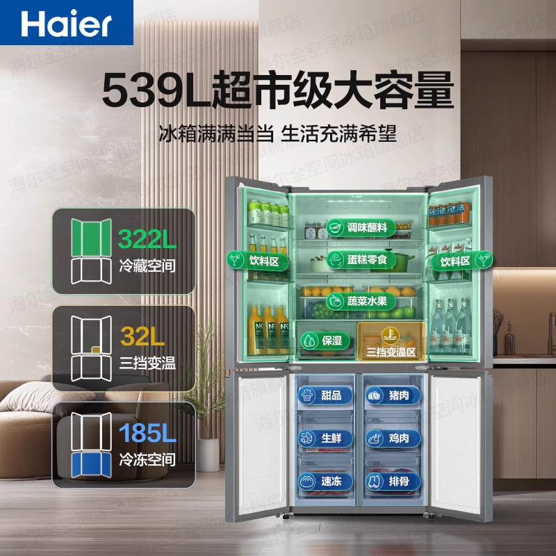 【热销爆款】海尔出品统帅冰箱539升十字四开门一级变频官方正品
