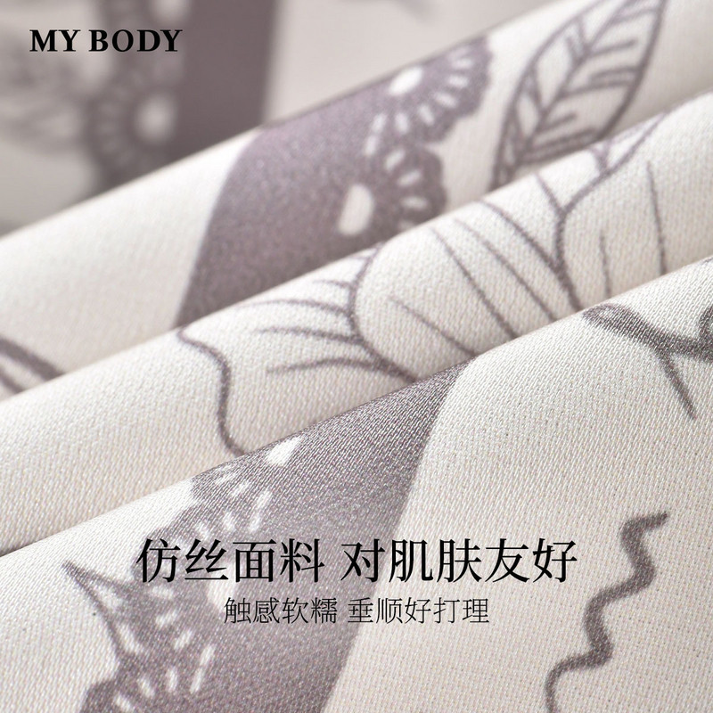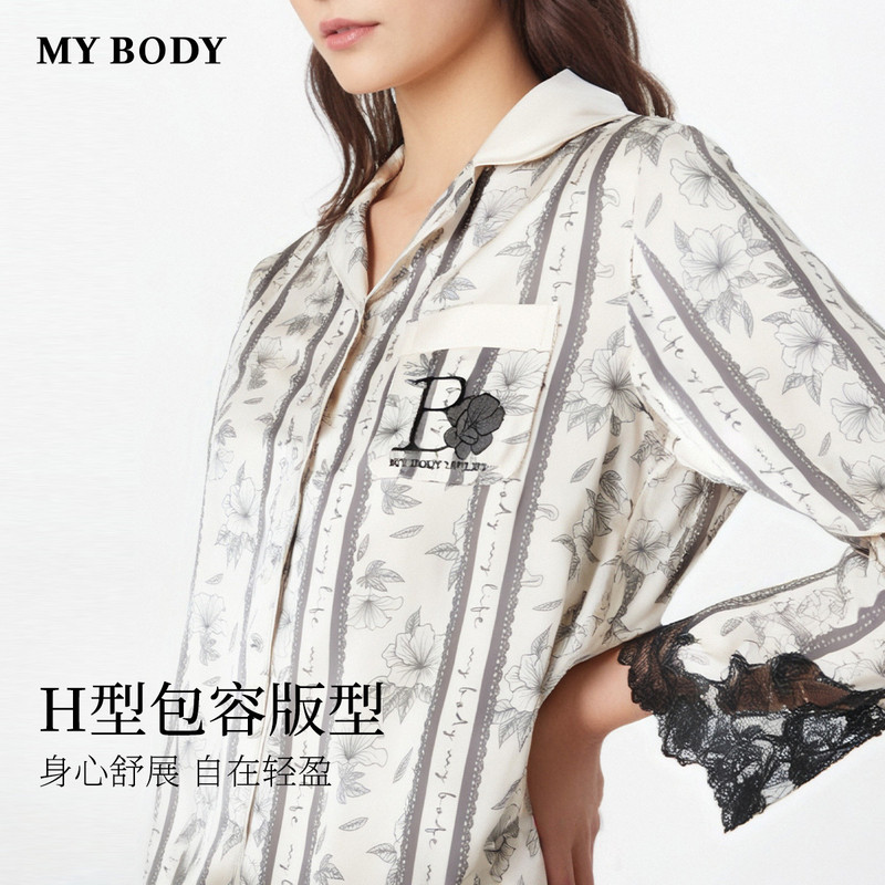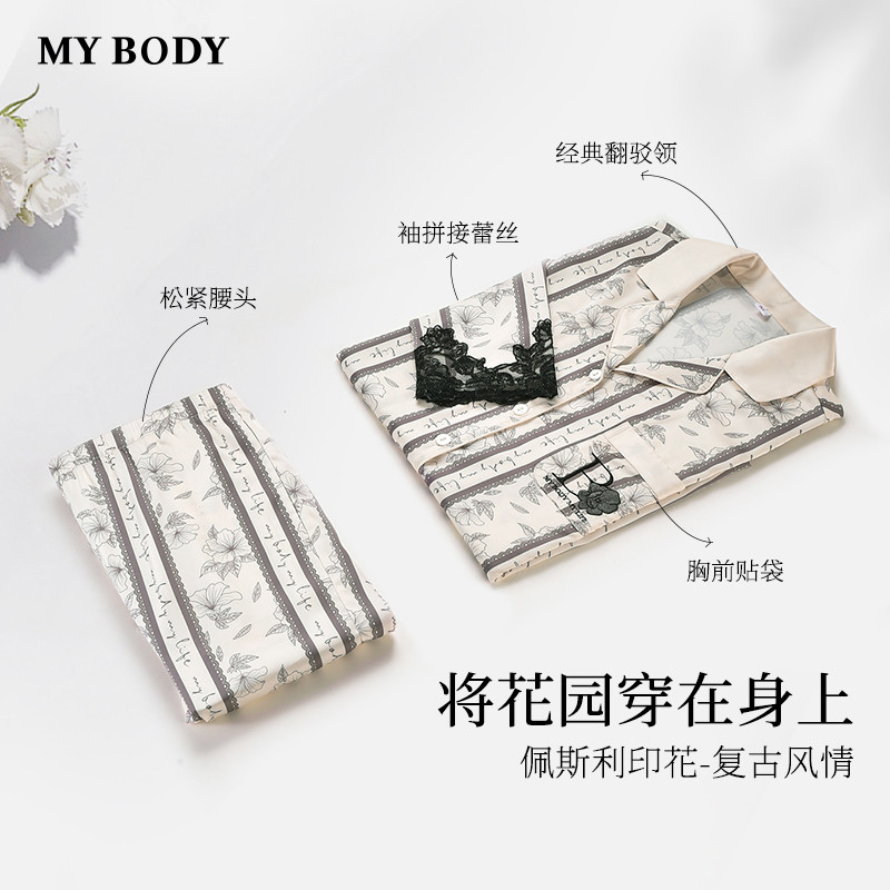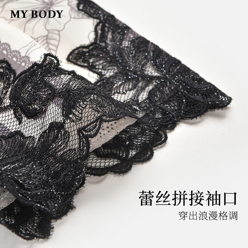 MYBODY商场同款睡衣女套装山茶花印花蕾丝袖长袖长裤可外穿家居服