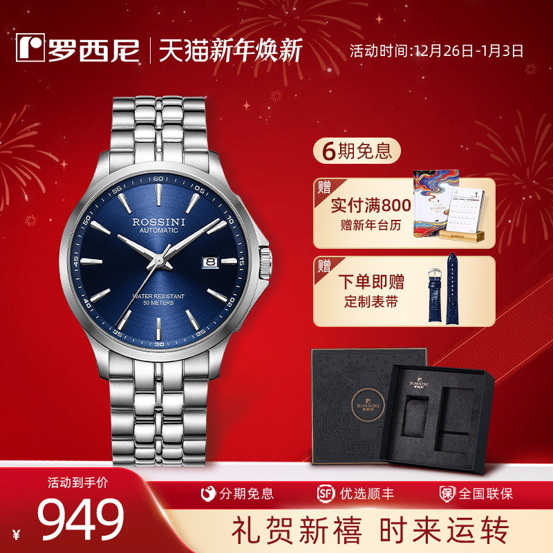 罗西尼官方手表男款正品男士机械表夜光防水商务男表礼盒5200005