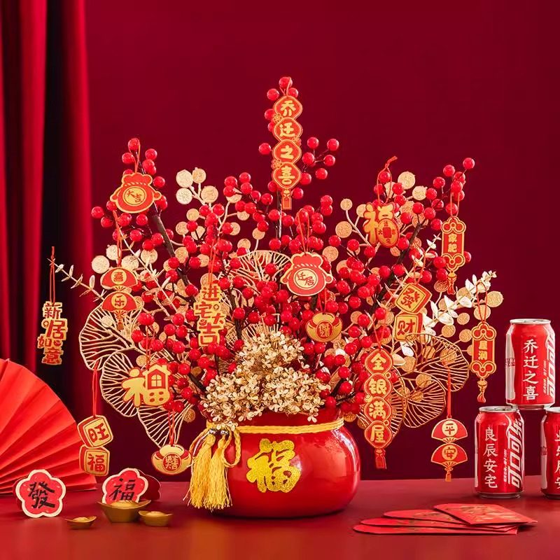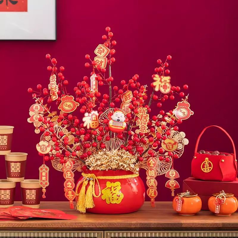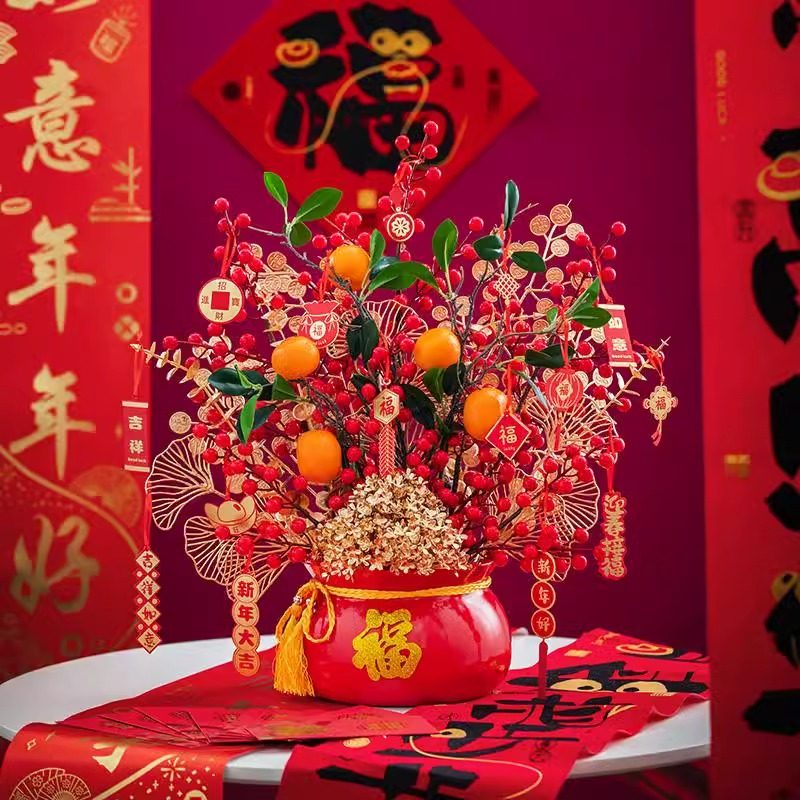 过年年宵花新年抱抱桶装饰花红果发财果客厅摆设乔迁礼物摆件仿真
