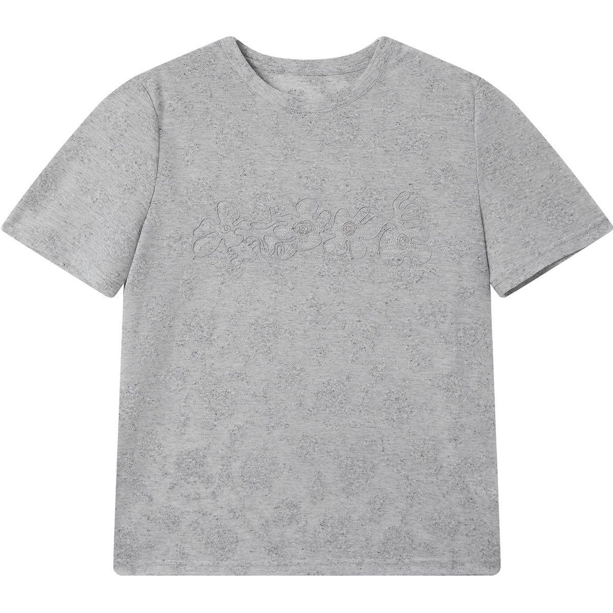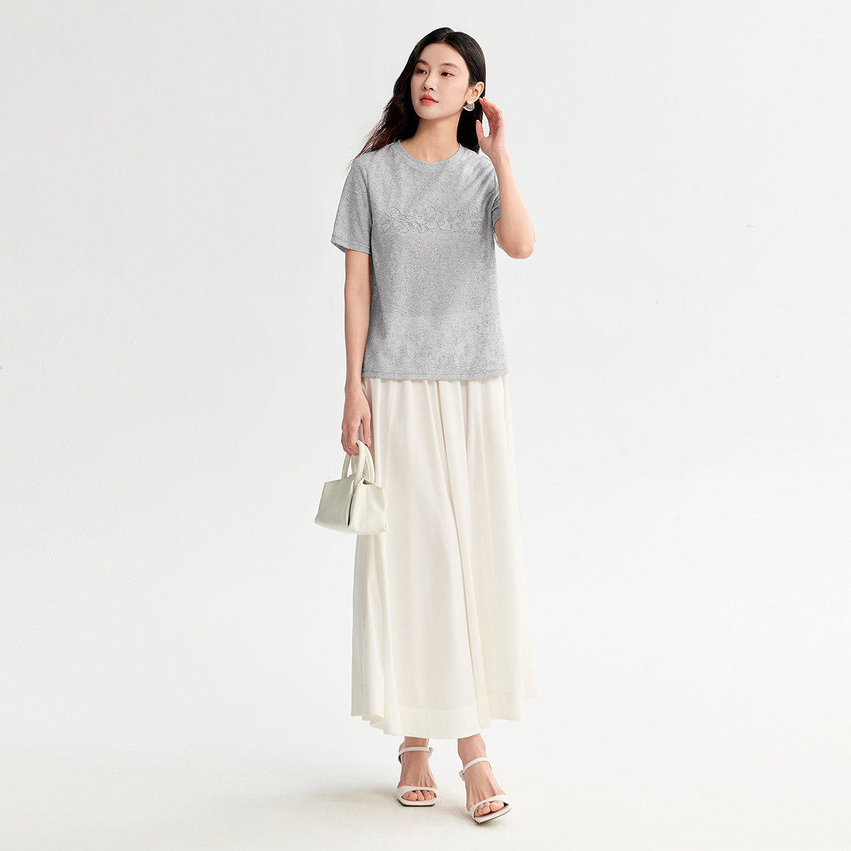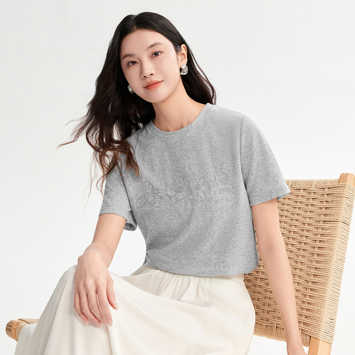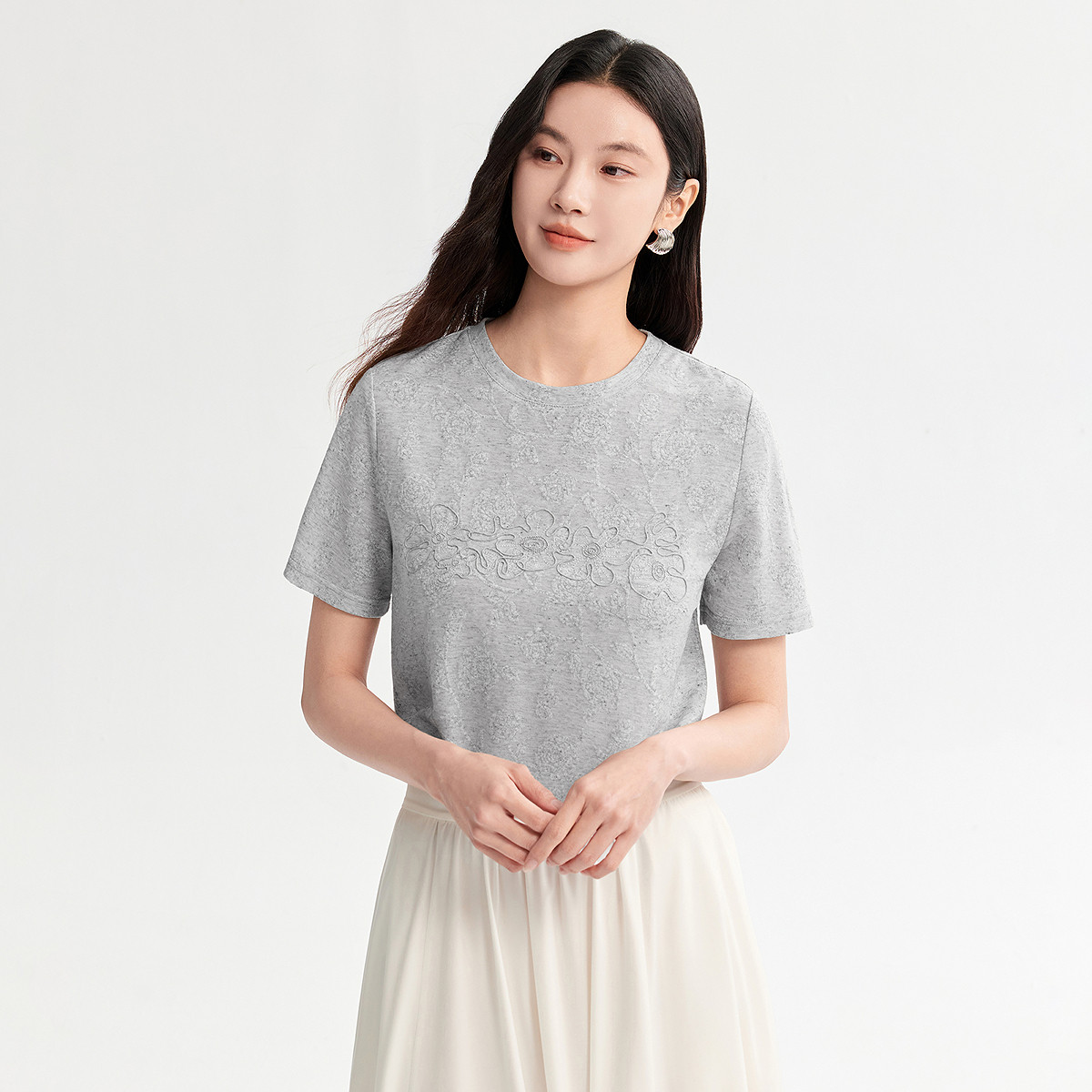 FINITY菲妮迪T恤2026年夏季新款简约蕾丝绣花圆领优雅短袖上衣女