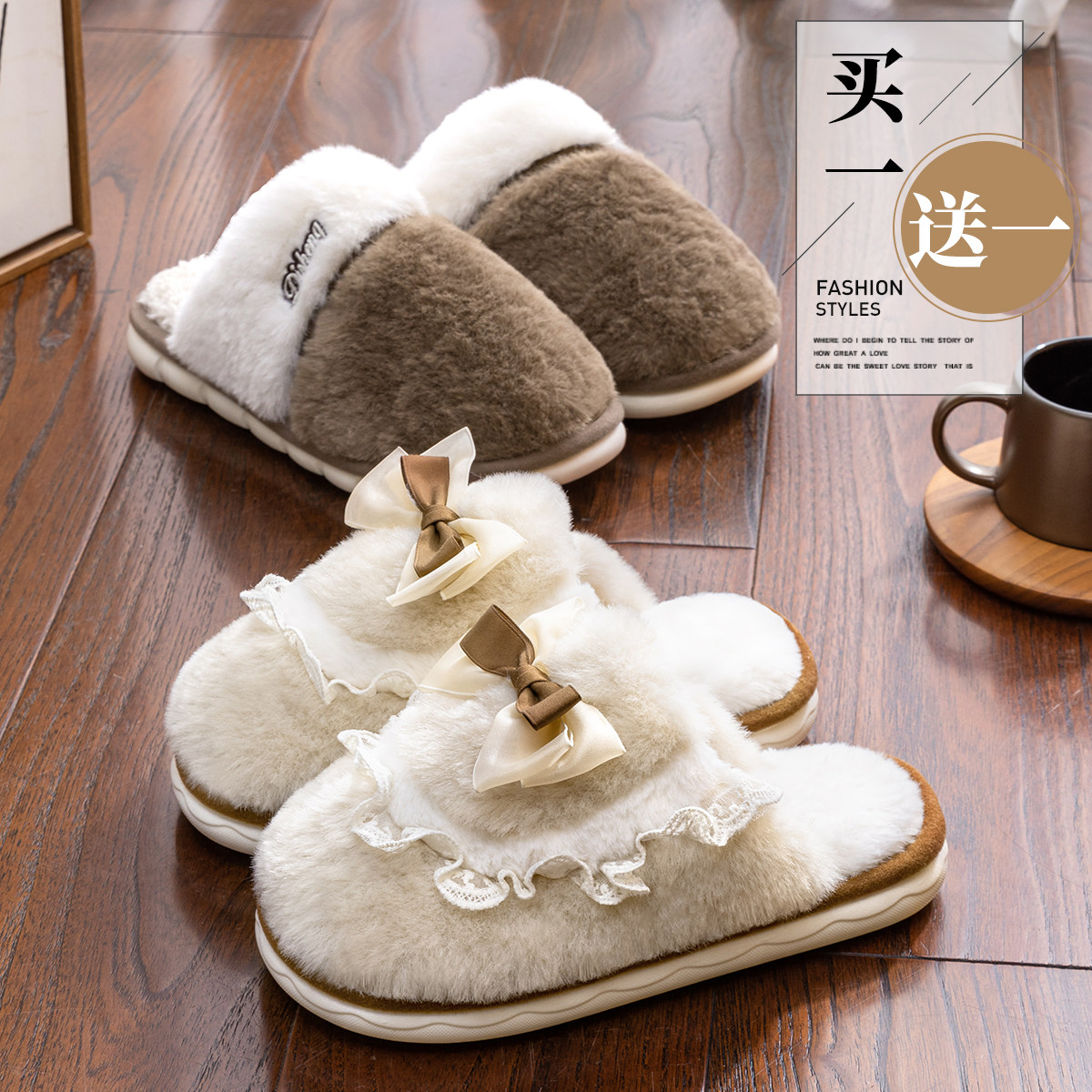 棉拖鞋情侣家居一对洁丽雅买一送一女款冬季室内厚底毛毛绒拖鞋男