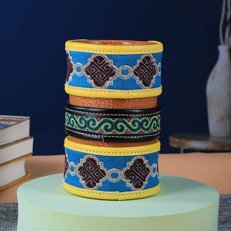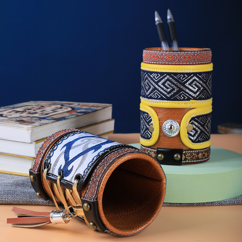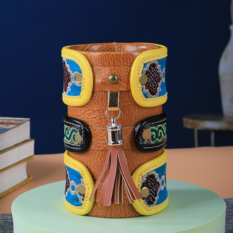 笔筒蒙古雕刻烫烙皮艺术元素民族风手工刺绣创意笔筒内蒙古特产