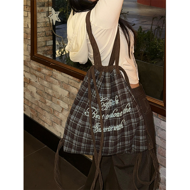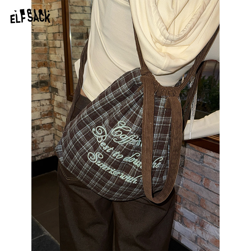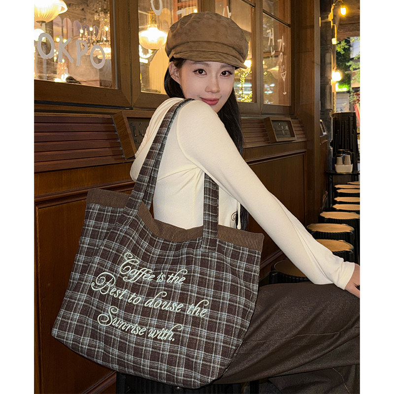 妖精的口袋字母刺绣复古格纹托特包2025冬季新款大容量单肩手提包