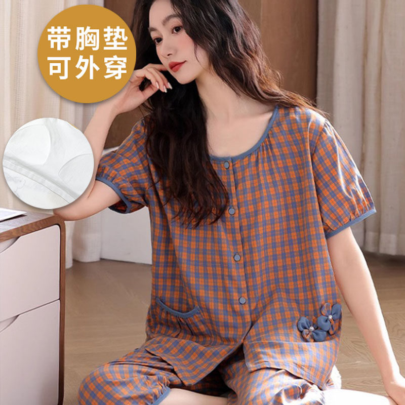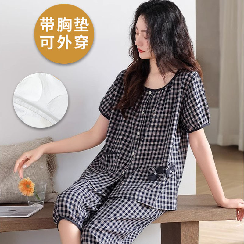 浪莎带胸垫睡衣女夏季云朵棉短袖七分裤薄款韩范家居服可外穿套装