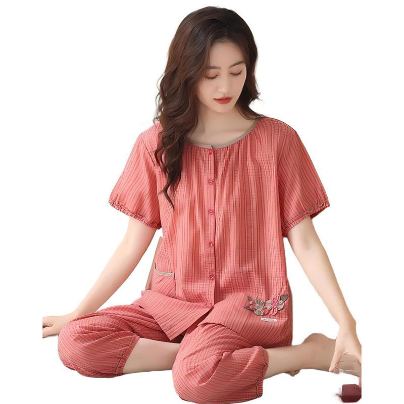 中老年人造棉睡衣女士夏季全棉绸短袖套装绵绸妈妈装加大码家居服
