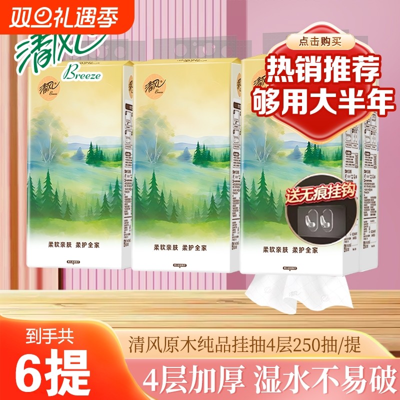 清风纯柔挂抽250抽4层悬挂式纸巾家用实惠装抽纸卫生纸巾餐巾纸