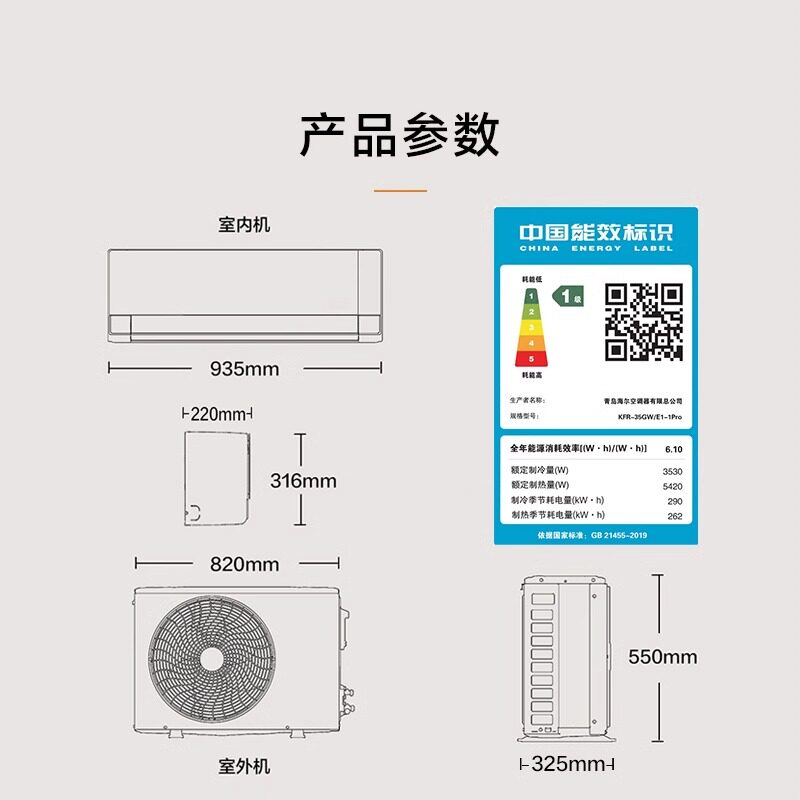 【纯铜管】海尔空调1.5匹1匹一级变频冷暖卧室挂机净省电E1旗舰店