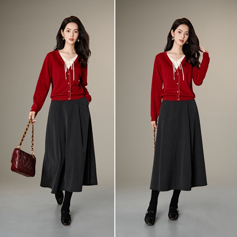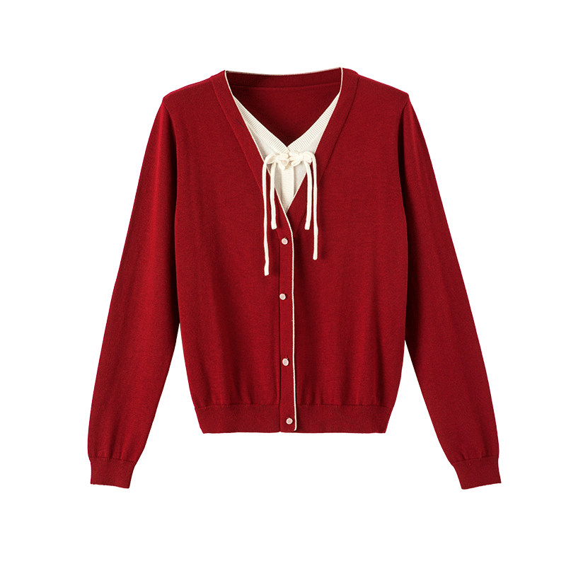 晚白2026年春新款时尚红色新年喜庆假两件设计感上衣修身针织衫女