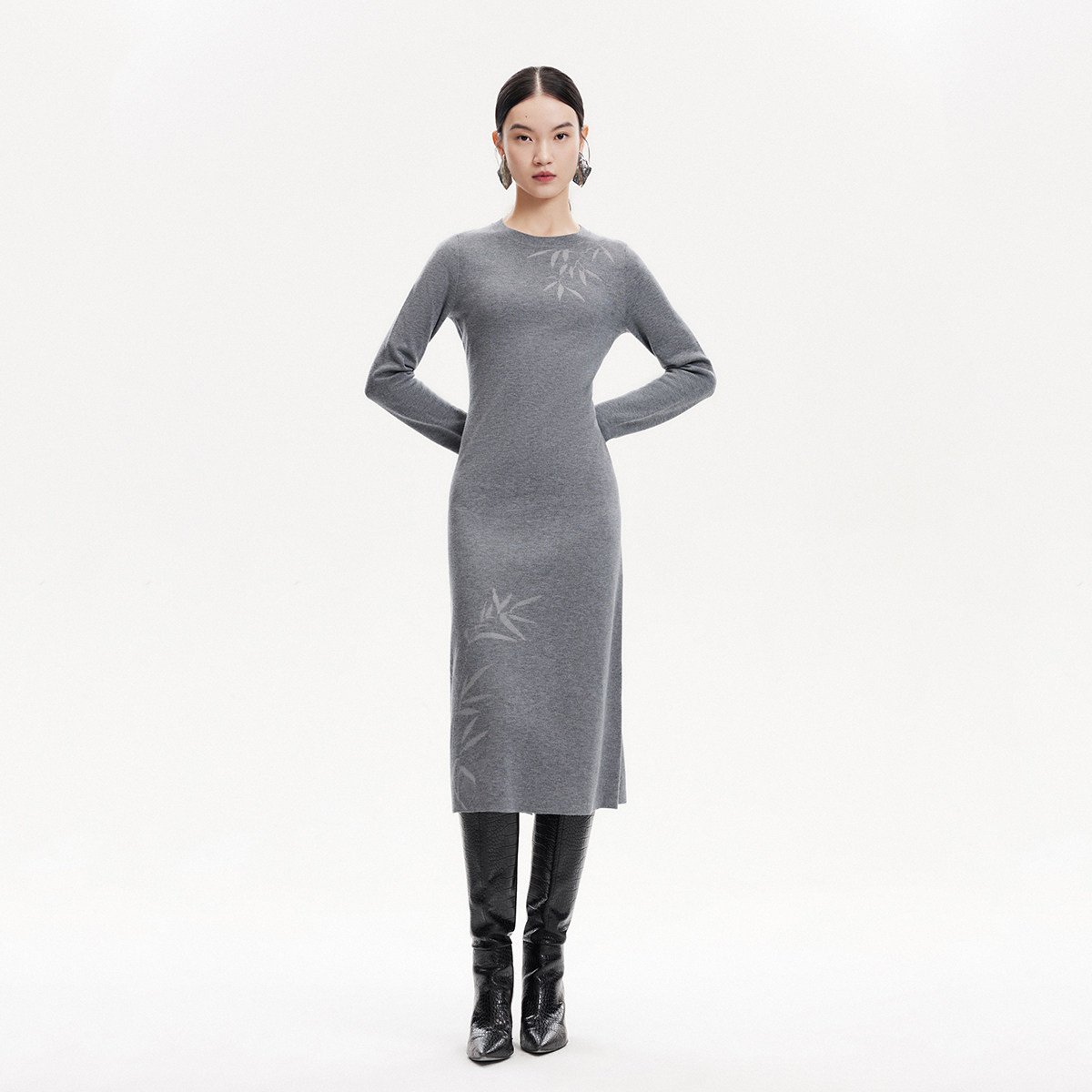 罗纹圆领,修饰脖颈线条;暗纹竹叶装饰