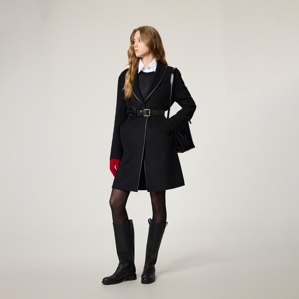 COCOBELLA设计感假两件大翻领毛呢外套女秋冬新款黑色大衣WL0002