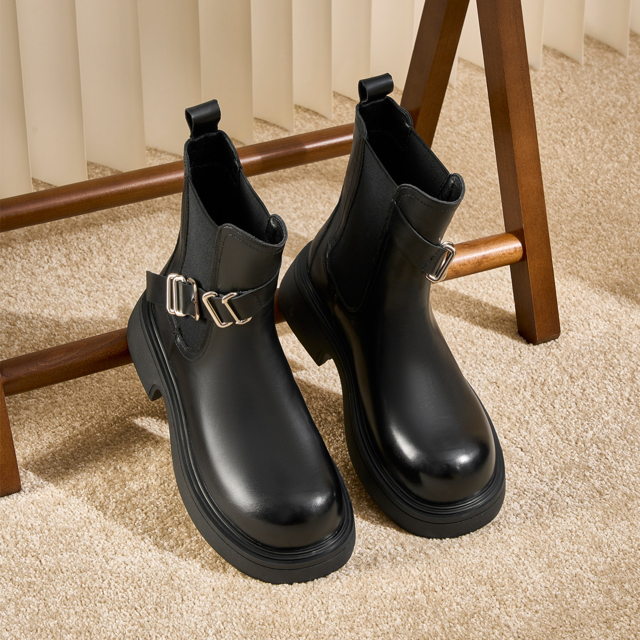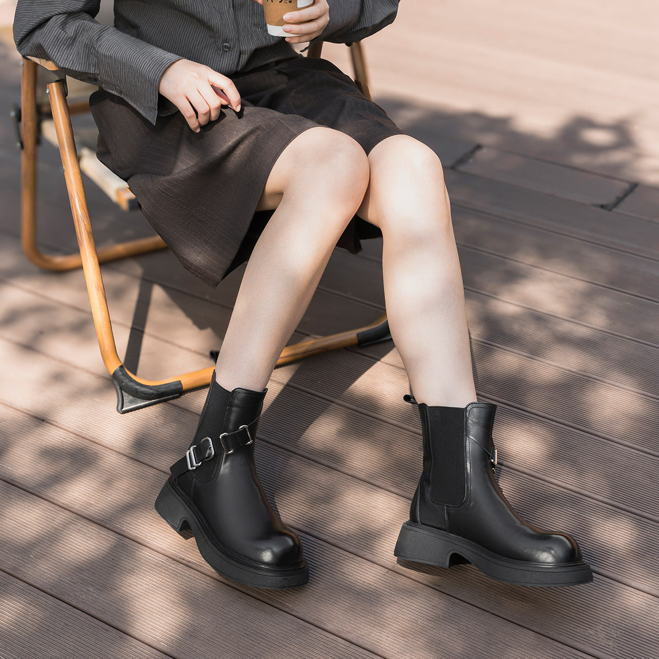 天美意复古厚底加绒切尔西短靴女鞋子瘦瘦靴时装靴皮靴2025冬新款