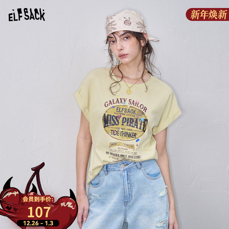 妖精的口袋复古印花短袖t恤女2025年夏季新款修身显瘦设计感上衣