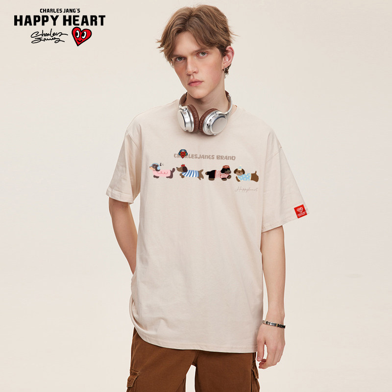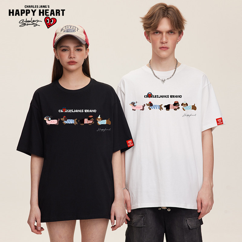 查尔斯桃心 卡通腊肠狗纯棉圆领短袖T恤男夏季情侣款宽松休闲半袖