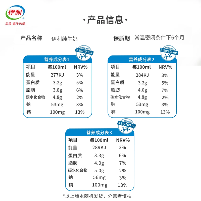 【官方授权】伊利纯牛奶优质乳蛋白学生成人早餐奶250ml营养早餐