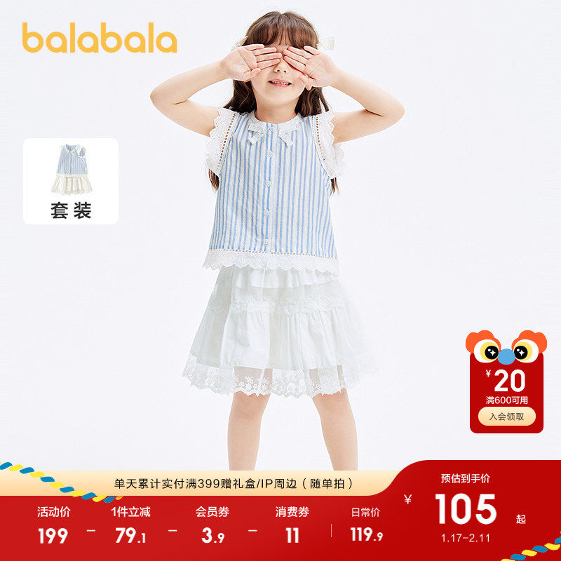 巴拉巴拉童装儿童套装女童短袖两件套2025新夏装条纹文艺蕾丝短裙