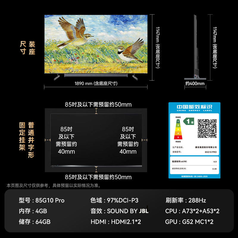 康佳小百灵G10Pro 85英寸MiniLEDJBL音响液晶电视机以旧换新补贴