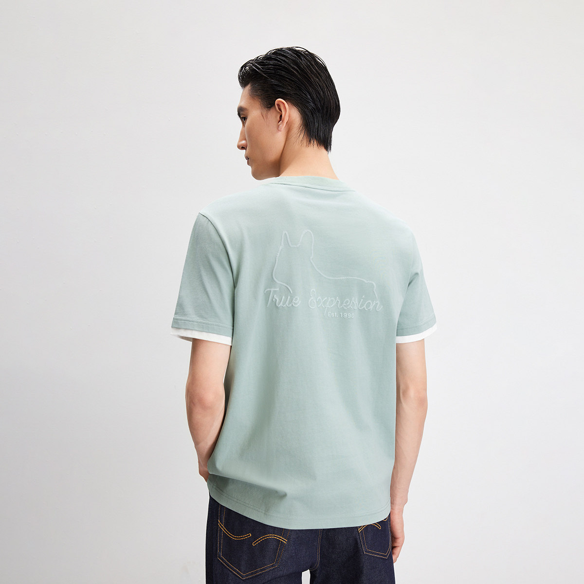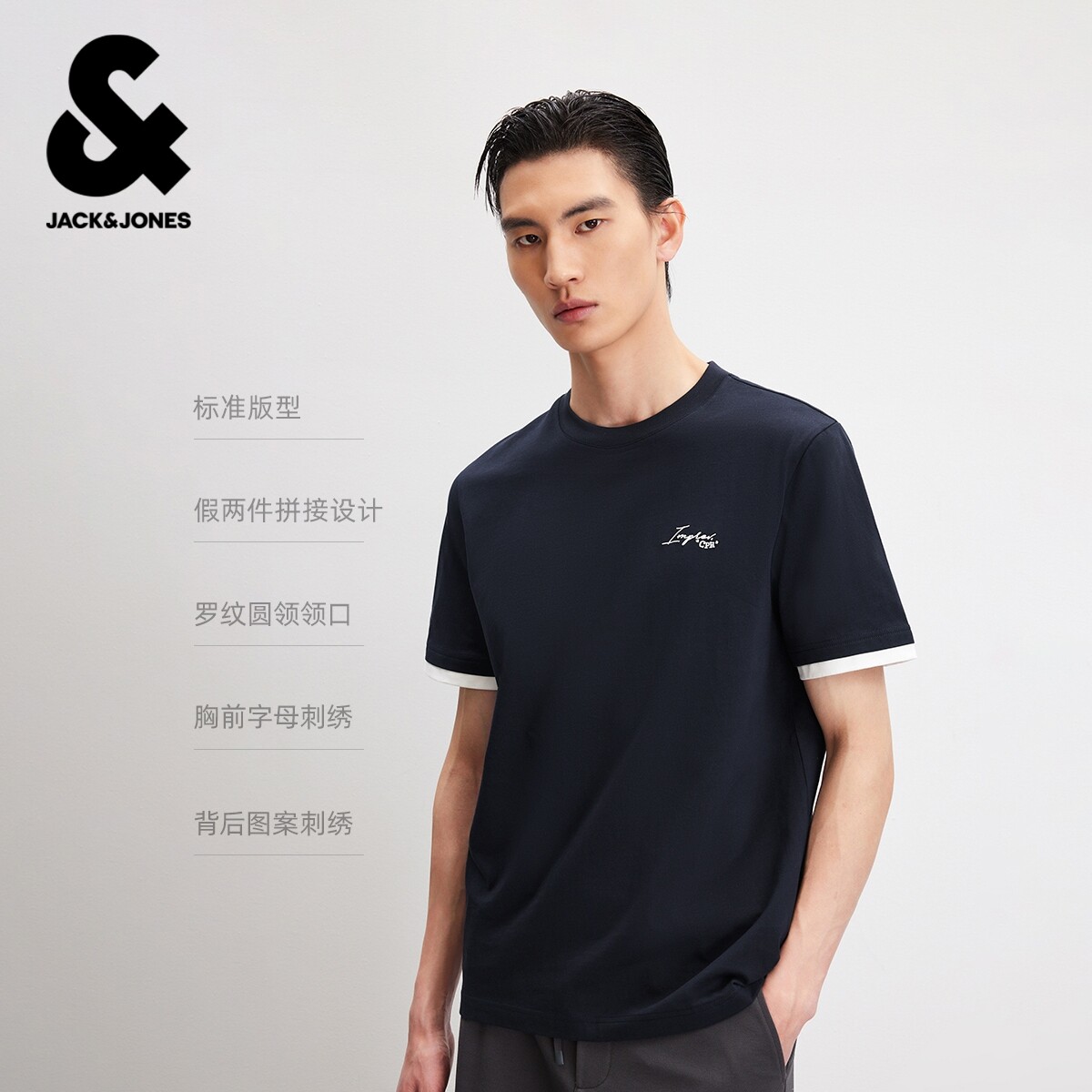 【假两件】杰克琼斯男装春季新法斗犬短袖T恤刺绣纯棉打底衫情侣