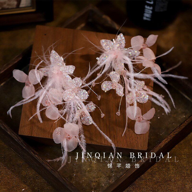 新款精致手工超仙粉色碎钻花瓣羽毛发夹新娘跟妆礼服晨袍头饰配饰