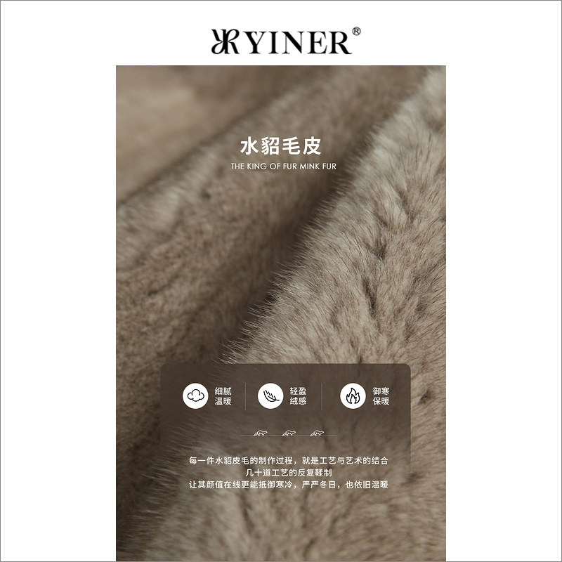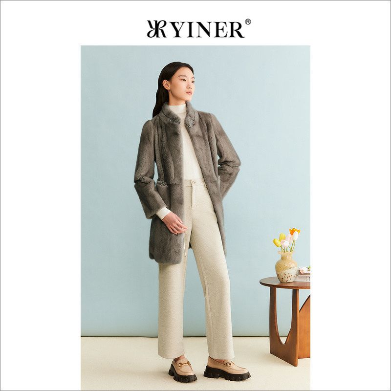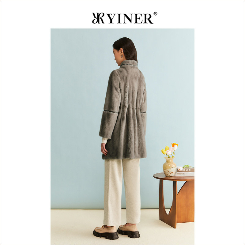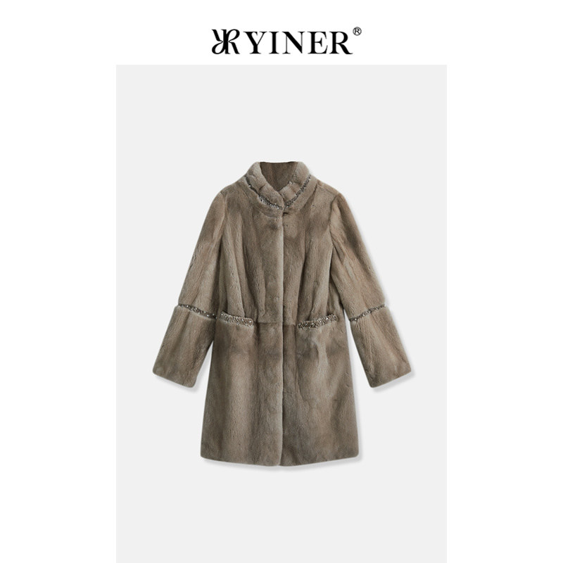 YINER音儿专选女装冬季法式中长款立领钉珠装饰水貂毛皮草外套
