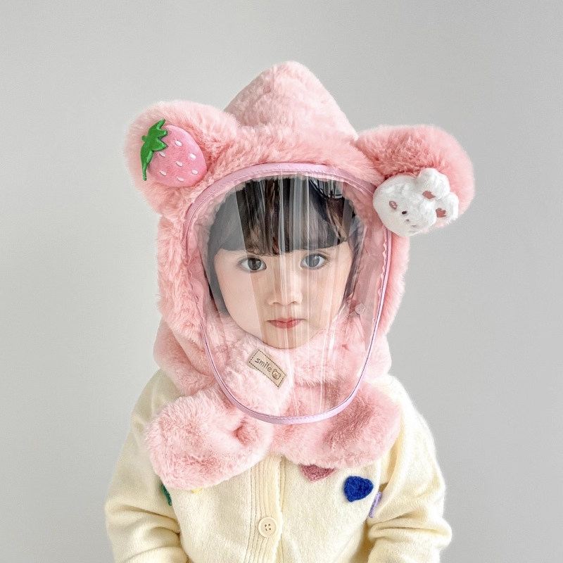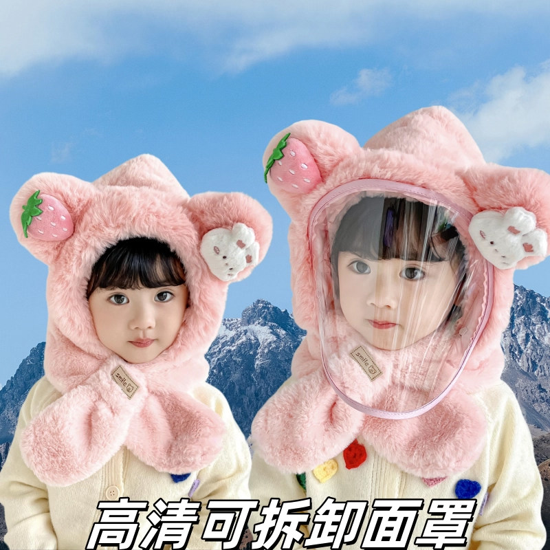 宝宝帽子冬骑行保暖毛绒帽男女童防护面罩儿童围巾手套一体帽防风