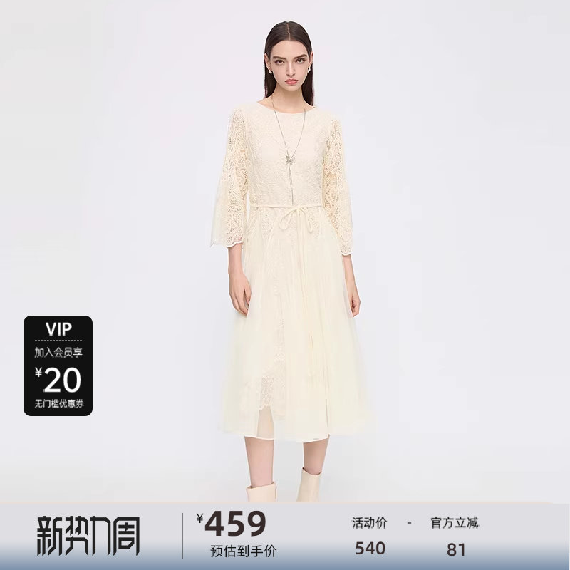 sdeer圣迪奥女装25年新品圆领绣花网纱收腰喇叭袖连衣裙S253Z1248