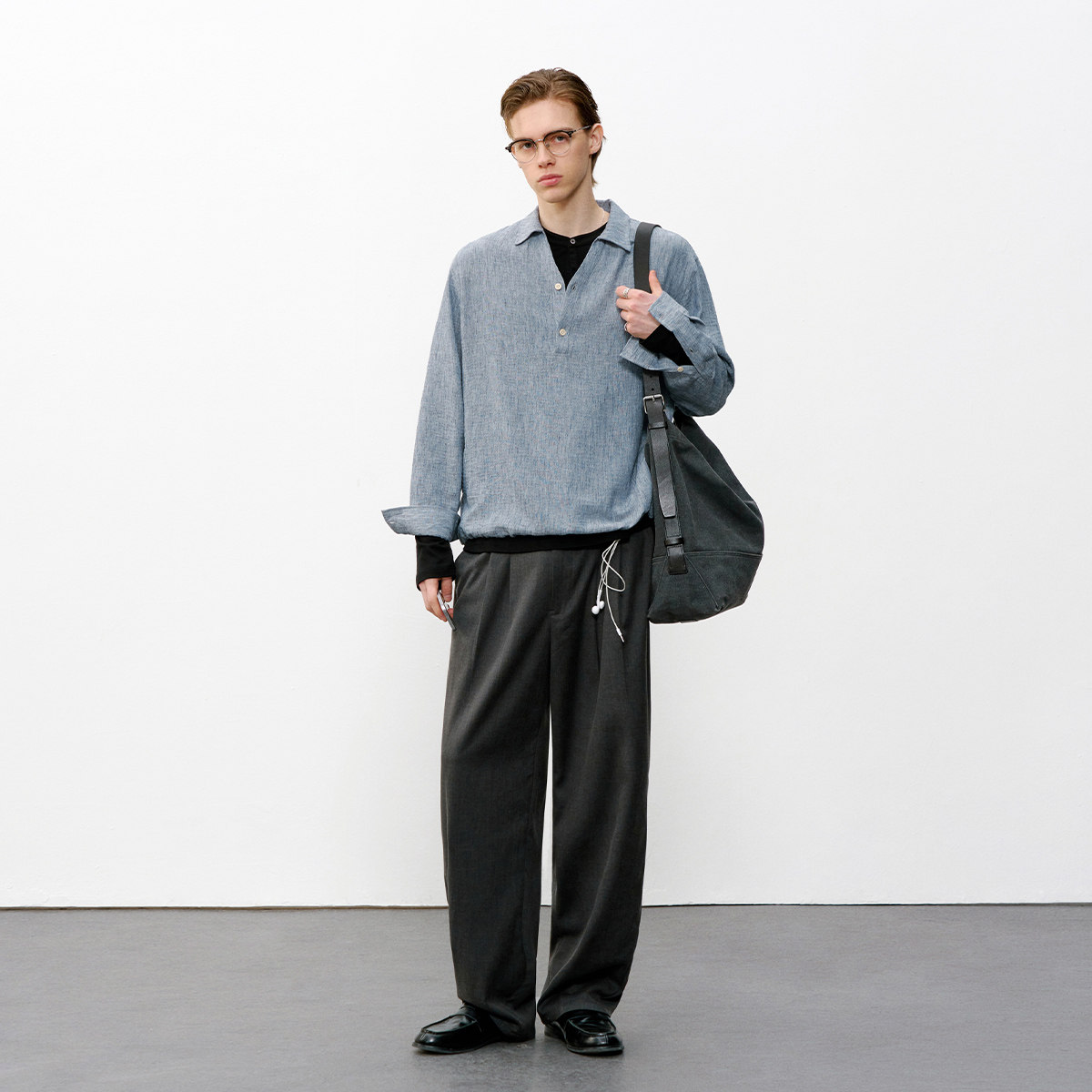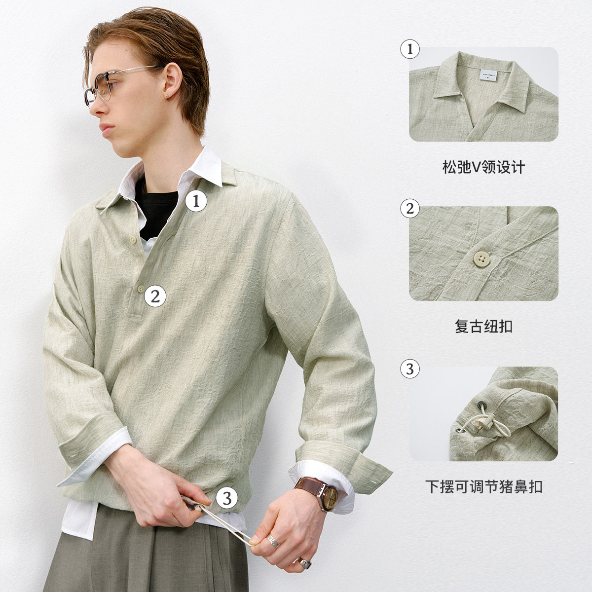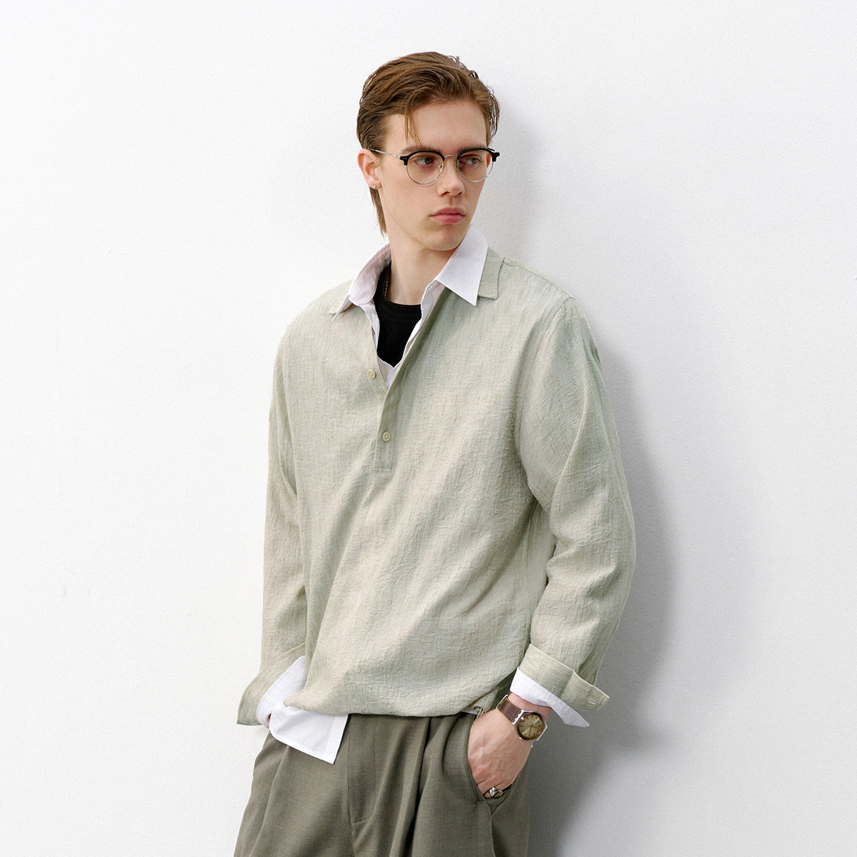 714street轻薄褶皱感色织cleanfit长袖POLO衫2026春季老钱衬衫男