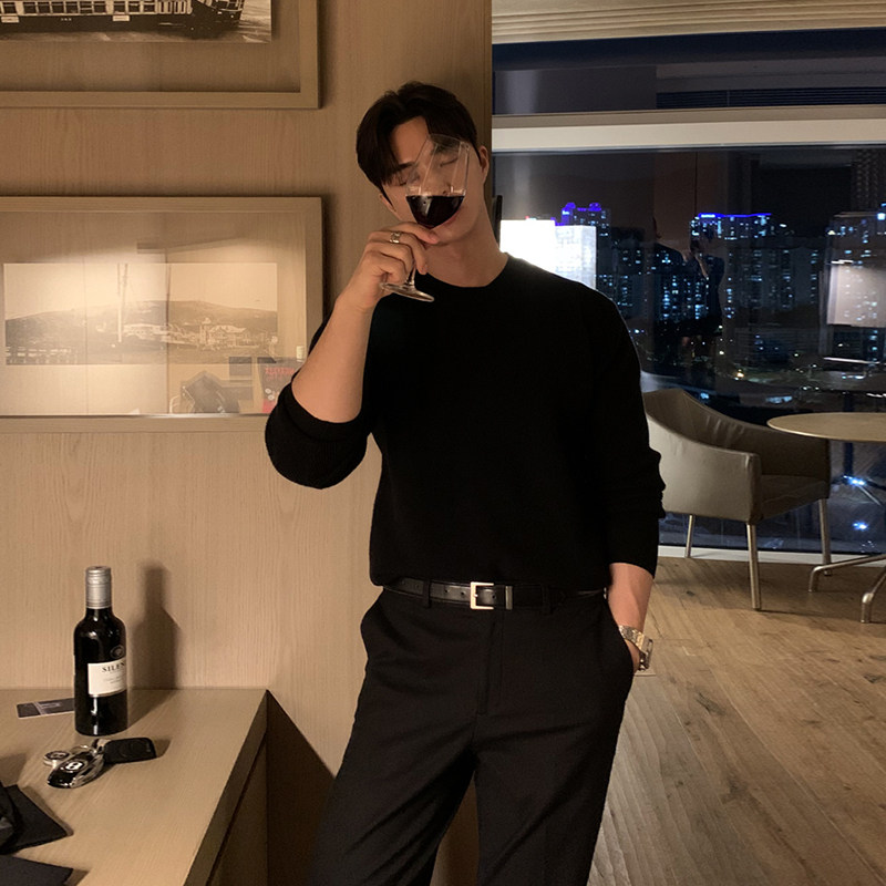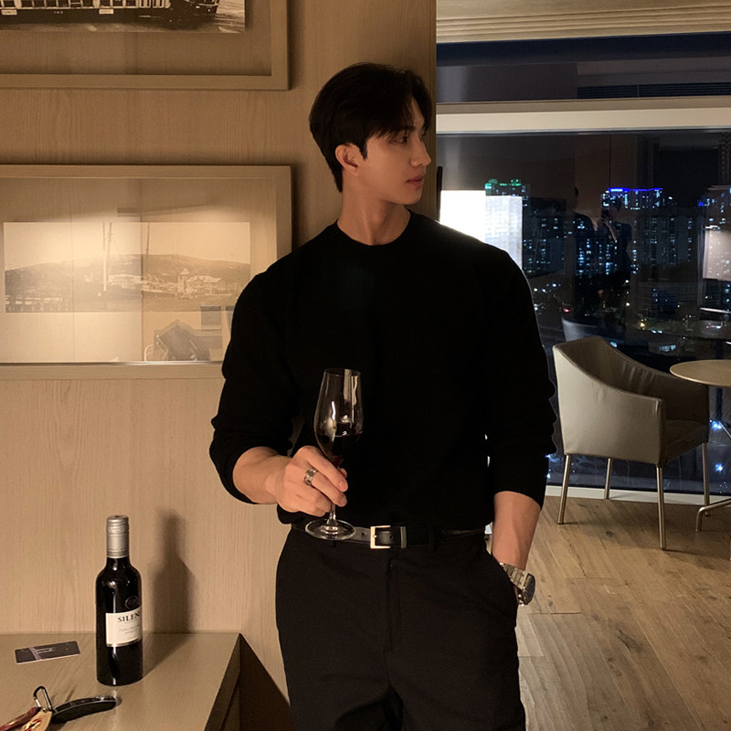 马登工装美式复古竖条纹亨利领毛衣宽松加厚黑色打底针织衫男秋冬