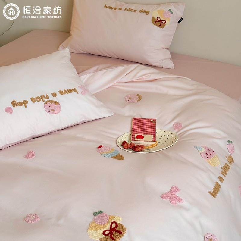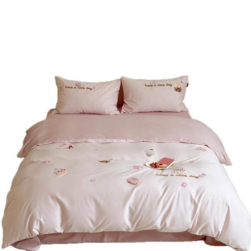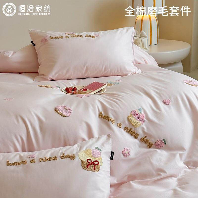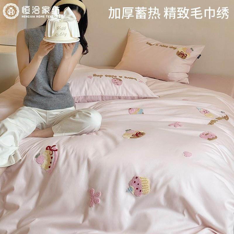 秋冬加厚全棉磨毛四件套少女心毛巾绣1.2m被套床上用品粉紫色床笠